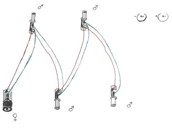 Myslím, že je to standardně používaný konektor pro většinu efektů - samec 5,5x2,5. Na začátek jsem si dal jednu samici, do který potom píchneš zdroj, za ní nekolik samců(kolik potřebuješ). Červený a zelený čáry ti ukazují, jak má být priletovanej kabel.