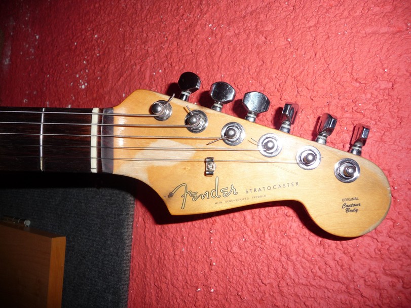 Teď něco k tomu jak to probíhalo. Já jakožto laik jsem vzal kytaru a odnesl místnímu opráváři panu Váchovi který má krámek ve Zlíně na ABS dříve známý jako BDDEY ve sklepě. Ten kytaru rozebral oškrabal hnusný lak a tělo se odeslalo k Furchovi na přelakování. Původně měla být kytara bílá ale vzhledem k nějakým problémům nakonec padla volba na černou, která lépe kryla. Použitý je nějaký spešl nitrolak z alchymistické dílny p. Furcha. co se týče krku, který byl "relicovaný" způsobem odraný bůhví čím a poškozená místa namořena nějakou sračkou, tak pan Vácha krk lehce zahladil a přelakoval matným lakem, aby byl krásně hladký a při hraní pohodlný. Co se mechanik týče daly se tam zpátky ty, které původně přišly, ale origo to nejsou. Značku a kvalitu přesně nevím, ale špatné asi nebudou. drží pěkně. Nicméně se musely vytáhnout zalomené šroubky na nich, materiál zatmelit a znovu upevnit. Pro přenos signálu jsem zvolil kombinaci snímačů 2x vintage noiseless a u kobylky Hotrail, který je navíc doplněn push - pull potenciometrem pro rozepínání cívek snímače. To jsem měl ještě celkem štěstí, že jsem doma našel pickguard černé barvy a vyhl se tak investici cca 1000kč. Co mně mrzí, tak že původní tremolo Fender, které bylo zdevastované se muselo nahradit. Pro zatím je tam no name China, které funguje sice stejně dobře, ale počítám že ten materiál za pár let půjde k šípku. jinak můžu tahat za páku jak chci a kytara krásně drží, ikdyž jsem se bál opaku. Ještě se samozřejmě dělalo zarovnání pražců a komplet eletrika. natáhly se struny, seřízeno jest a můžeme vesele hrát.