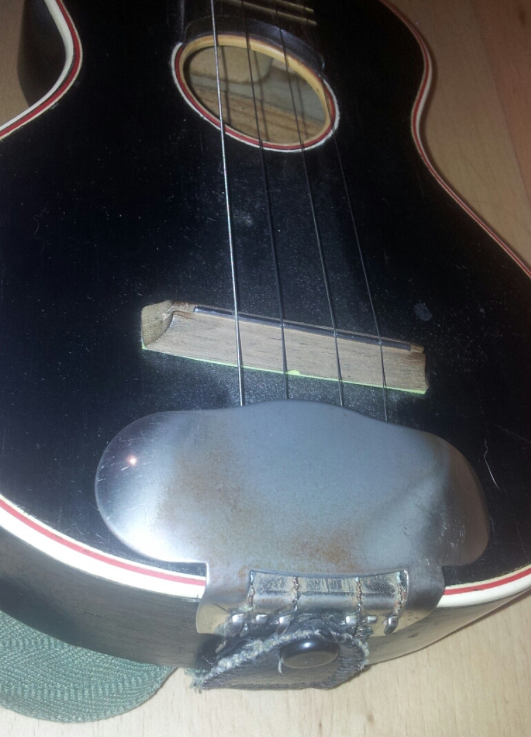). Tenkrát jsme začali brnkat na kytary a kamarád donesl tohoto drobečka.Dal mu ho táta který si ho koupil když byl na vojně mohlo to být kolem roku 1960.Je z poctivého dřeva prý z mahagonu. V našich rukách prošel několika ůpravami - ladící kytarové mechaniky místo "houslových kolíků" a samozřejmě struník aby jsme tam prdly kovové struny.Nikdy jsem ho neslyšel hrát bez kovových strun.Tenkrát v době temna (internet nebyl) jsme ani nevěděli jak ho ladit. Nakonec jsme ladili o oktávu výše než kytaru.Struny jsme použili oktávové z 12-ti strunné kytary.Zvuk celého ukulele byl dosti výrazný a při hře s kytarou ho bylo docela dobře slyšet.Tenkrát to tohle ukulele vydrželo a mám ho dodnes.Krk se neprohnul ale trochu se propadla přední deska pod kobylkou.A věřte mi ty struny tam jsou natažené pořád.Dnes už bych ale takový pokus neopakoval.To dnešní co mám je víc ukulele a nylonky mi vyhovují.