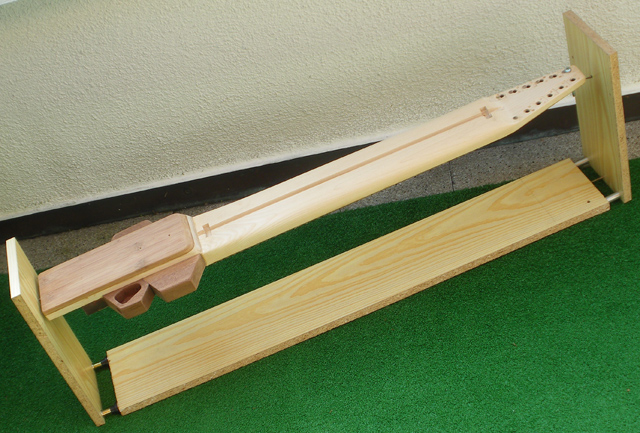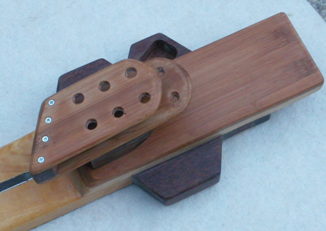 Tím moje dílnička neoplývá a tak jsem použil bambus - krájecí prkénko, hranolek z mahagonu a "botička" je z odřezku ořechového dřeva. Zkompletuju to až po lakování