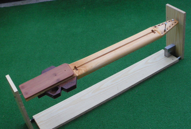 Tím samozřejmě potřebujeme k nastavení výšky bud ploché kleště nebo kousek kovové trubičky ca. 8 mm Ø, která se na konci mírně zploští. Na Monochordu z bukové laťky (menzura 686) jsem natáhl strunu A (.034") a všechno funguje, zvuk té laťky je úctyhodně brilantní A abych nezapomněl, snímače soapbary P 90 už mám