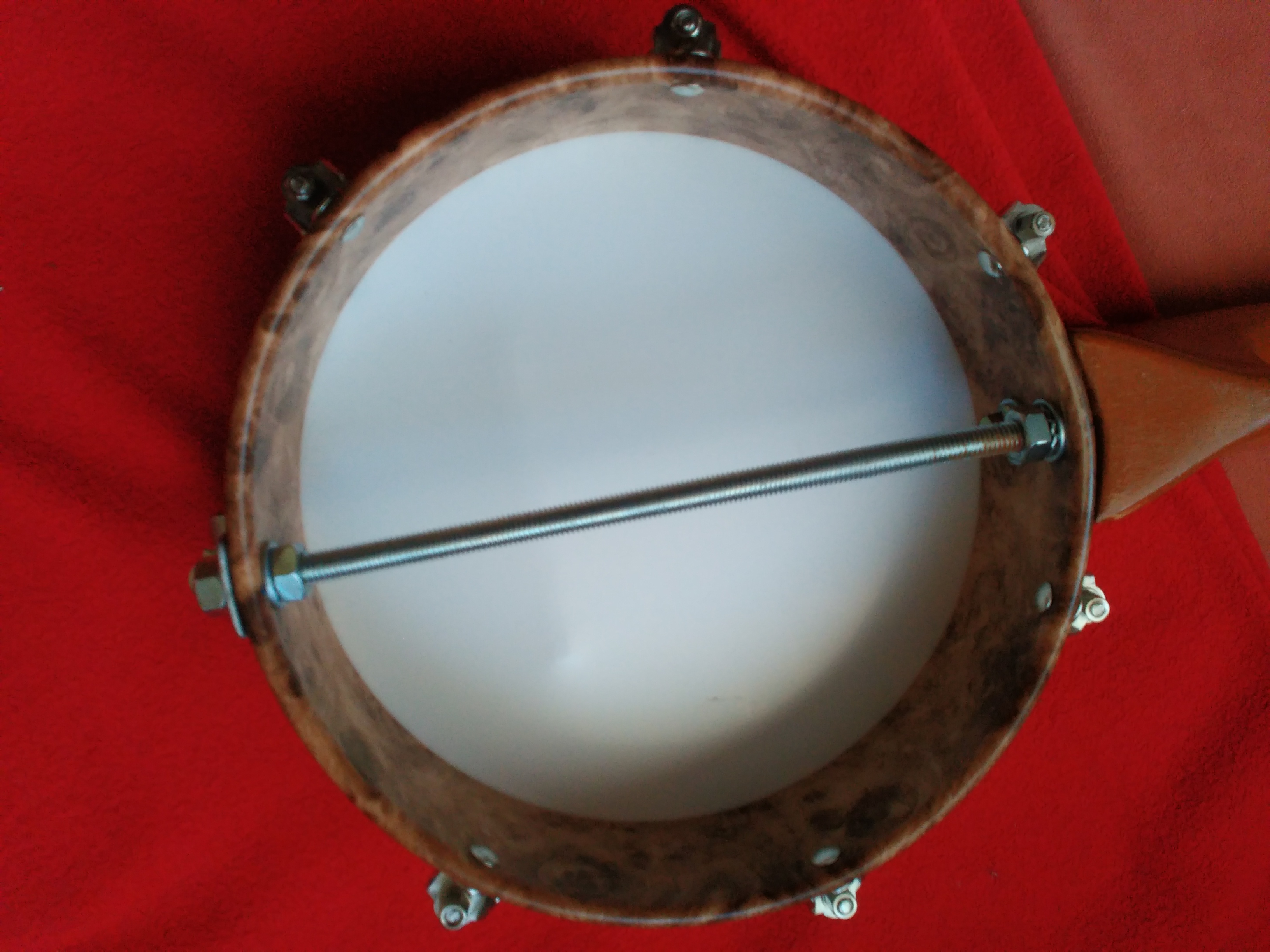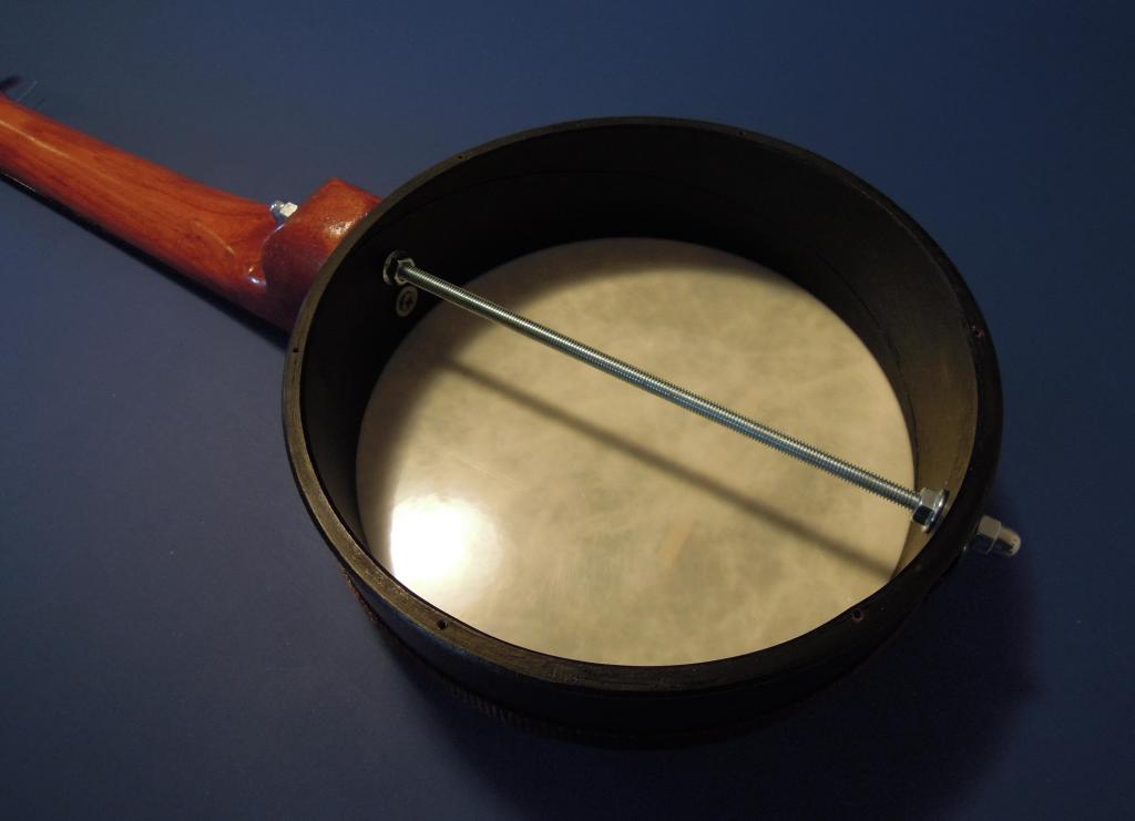 Je to dřevěný hranol. Mám trochu problém s délkou tónu. Vyzkoušel jsem co to udělá, když tam dám malou dřevěnou podpěru. Když je přímo pod kobylkou, tak je délka tónu dobrá, ale ztrácí hlasitost a "banjovost". Když posunu trochu bokem, tak jsou tyhle věci v pořádku a délka tónu je o něco lepší. Měl bych vyzkoušet spíš změnit úhel krku nebo výšku kobylky/struníku, ale do toho se mi už nechce moc zasahovat. Tím spíš, když nevím, v čem je přesně problém.