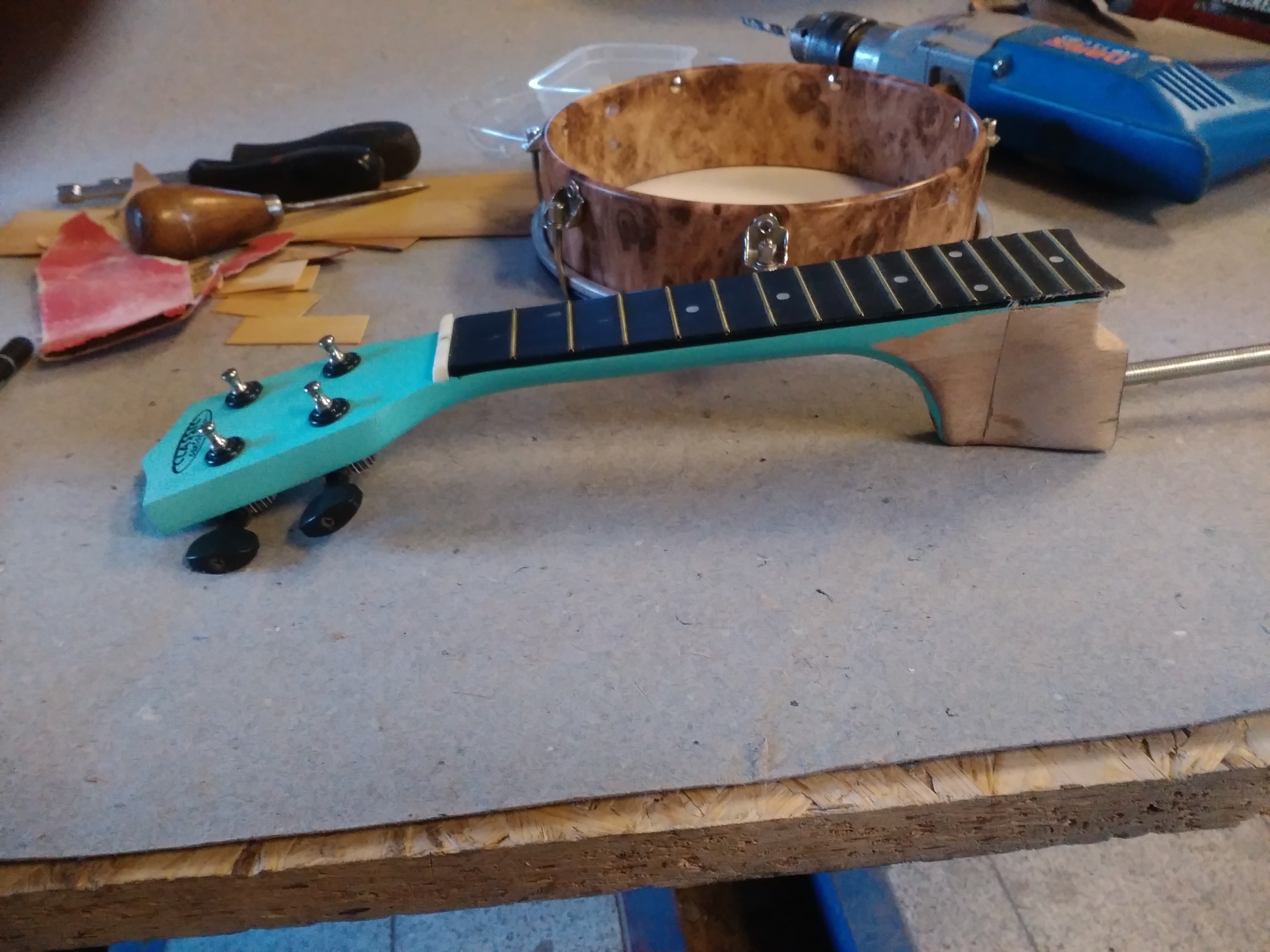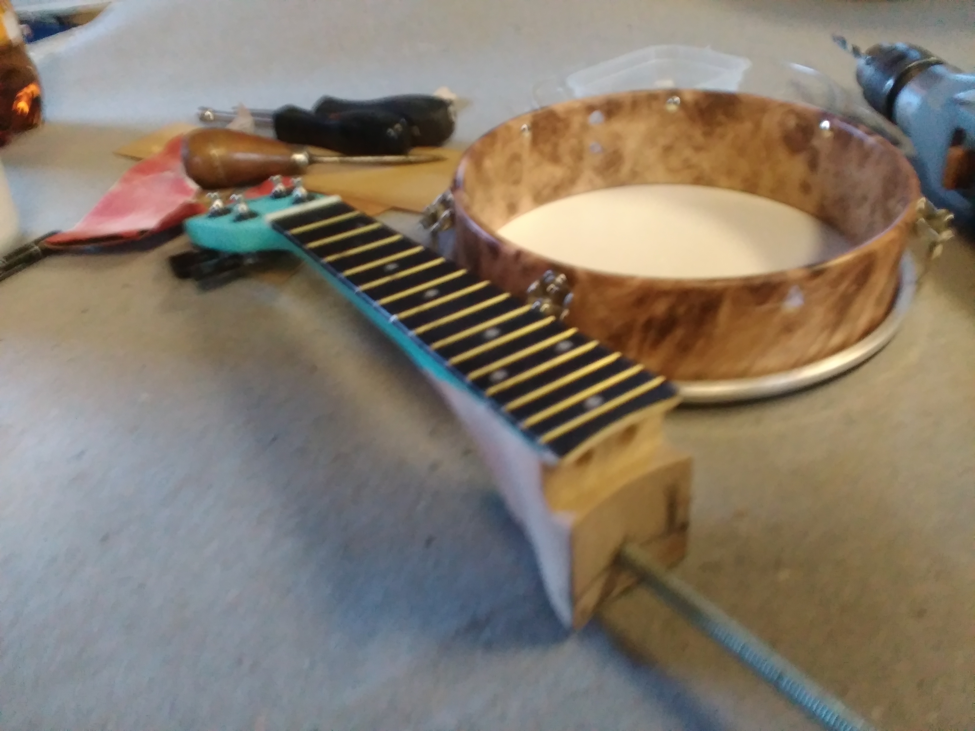 Výroba : krk- rozšláplé ukulele objednané z netu ( prodloužený o část k bubínku)