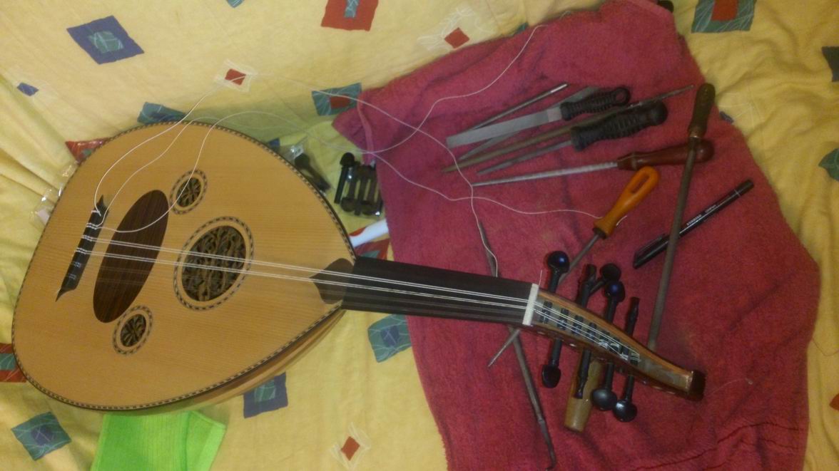 Největší problém, kromě intonace...teď mám s výměnou strun. Dole u kobylky je to v pohodě, to je jako na španělce. Horší to je, ale nahoře ty "houslové" kolíky budou potřebovat určitě nějaký typ uzlu. Bohužel to jak to tam mám navázáno já...to raději nebudu popisovat, je vidět že na tenhle nástroj měl můj kamarád do počtu a struny tam nechal navázány nejspíše ještě originální: Z historie tenhle nástroj patřil jedné bohaté turkini, která mu ho vlastně věnovala, původně měl jít na konzervatoř. Což je super zpráva, protože je to tím pádem použitelný nástroj. Teď jen vyřešit ty struny. Kamarád neporadí, protože není dostupný. Takže zbýváte vy...:)