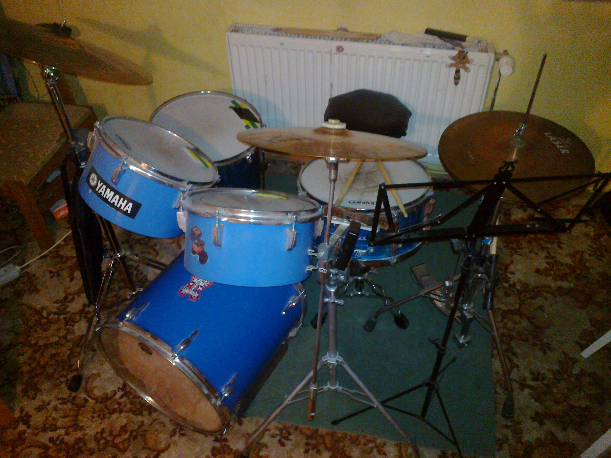 Tuhle soupravu jsem zbavila rezonanček, polepila černou tapetou, rozšířila o další kopák, k tomu dvě bonga 6 a 8" a kovový snare 14x5,5". Chvíli jsem měla i 18" kotel (to už ale bylo moc) a snila jsem o těch hlubokých tomech rampové soupravy Amati;)