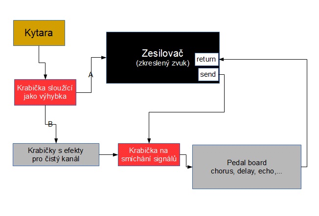 Takhle nějak jsem si to myslel. Zajímám se o ty dvě červené krabičky. Tu krabičku, kterou jsi zmínil, bych mohl využít jako tu první, která je hned za kytarou. Posílala by signál buď cestou A (do zesilovače na zkreslený zvuk), nebo cestou B (mimo zesilovač do krabičky/krabiček určených k dosažení co nejlepšího čistého zvuku). Druhá krabička by pak oba signály spojovala do jednoho, ale musí je opravdu míchat, ne přepínat mezi cestou A a B, protože kdyby byla přepínatelná, tak bych musel vždy při změně kanálu/cesty A a B přepnout obě červené krabičky. Samozřejmě musíme brát v potaz, že ten čistej zvuk i kdyby se povedl, tak se s tím zkresleným zvukem z lampovýho zesilovače asi nebude moci kvalitou rovnat, ale já bych ho používal pouze jako druhý občasný kanál podřadný tomu zkreslenému. Zajímá mě ale, jestli to vůbec jde touto cestou a jestli z toho nepoleze jenom prasozvuk, nebo třeba vůbec nic.