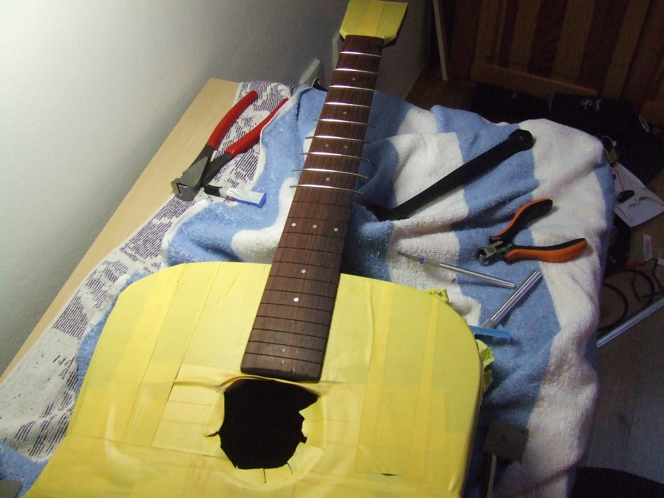 Se svojí první kytarou Meipet jsem si dost "máknul",prasklá přední deska,výměna pražců