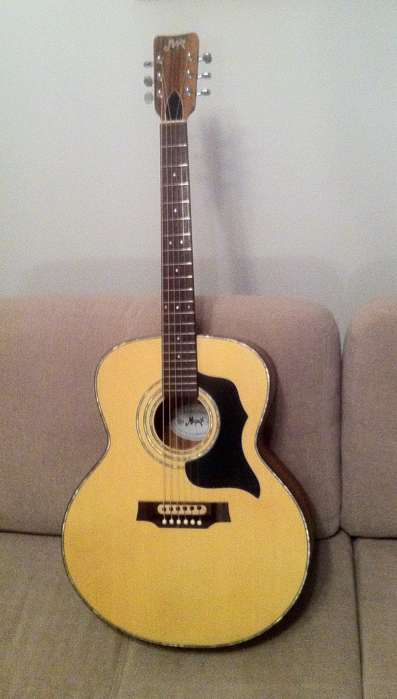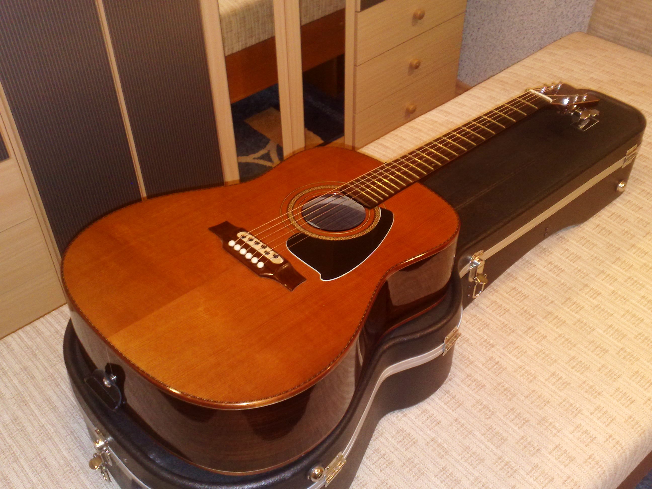 V roce 1995 jsem v Plzni na Americké kupoval kytaru a řekl jsem, že chci tu co má nejlepší zvuk. Přinesli mi kytaru Meipet. Byla velká a asi nejdražší jakou tenkrát měli - na tu dobu za neuvěřitelných 11.5 tisíce. Zkoušel jsem i jiné, ale žádná už se jí nemohla rovnat tak jsem jí nakonec koupil. Nemohl jsem na ní sehnat pouzdro tak jsem zavolal pana Meindlsmida. Byl příjemný, řekl mi, že jsem se u něj měl zastavit když jezdím do Chebu, že bych měl větší výběr,nebo možnost výroby dle přání a poradil mi firmu kde mi pouzdro vyrobili během jednoho dne. Kytaru mám dodnes, moc jsem na ní nehrál, takže vypadá hnedle jako nová. Horní deska je cedr, boky a záda palisandr a krk je z více vrstev - z mahagonu a asi palisandru. Je to Déčko ale větší než třeba Yamaha FG 730 S ( o 10 mm hlubší, o 10 mm širší a o 30 mm delší tělo i celková délka). Krk je jako obvykle u Meipetů 47 mm. Je to pěkná ruční práce, mám na ní od mistra i pasport.