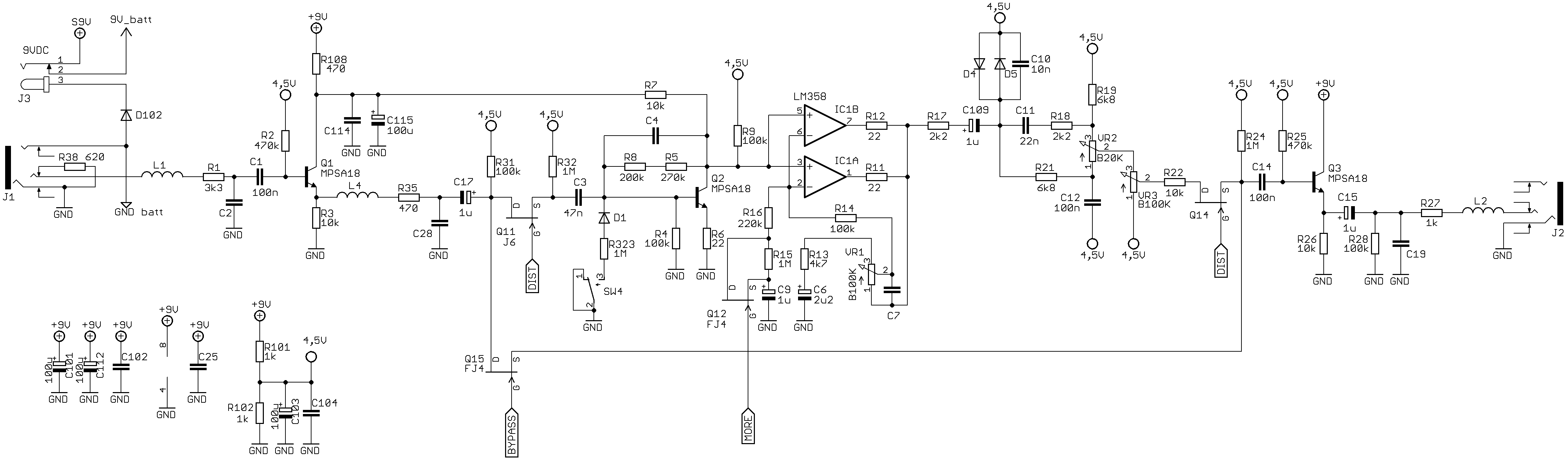 Takže je to lehce modnutá DS-1. Paralelně zapojené půlky opampu jsem neviděl, pokud není třeba budit něco nízkoimpedančního. Diody D4 a D5 jsou stejné Si?