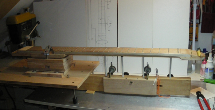 Dneska jsem T-EXP "napnul na skřipec", zvaný "Neck Jig", aby se hmatník při přebrušování pražců do roviny nemohl prohnout. Před tím jsem napnul 12 drátů o průměru jako H-struna kytary aby to simulovalo celkový tah strun. Bez předpětí výztuhy bylo prohnutí hmatníku necelých 0,8 mm. Po odstranění strun jsem ty čtyři podpěry dorazil tak, aby hmatník byl v rovině, bez prohnutí: