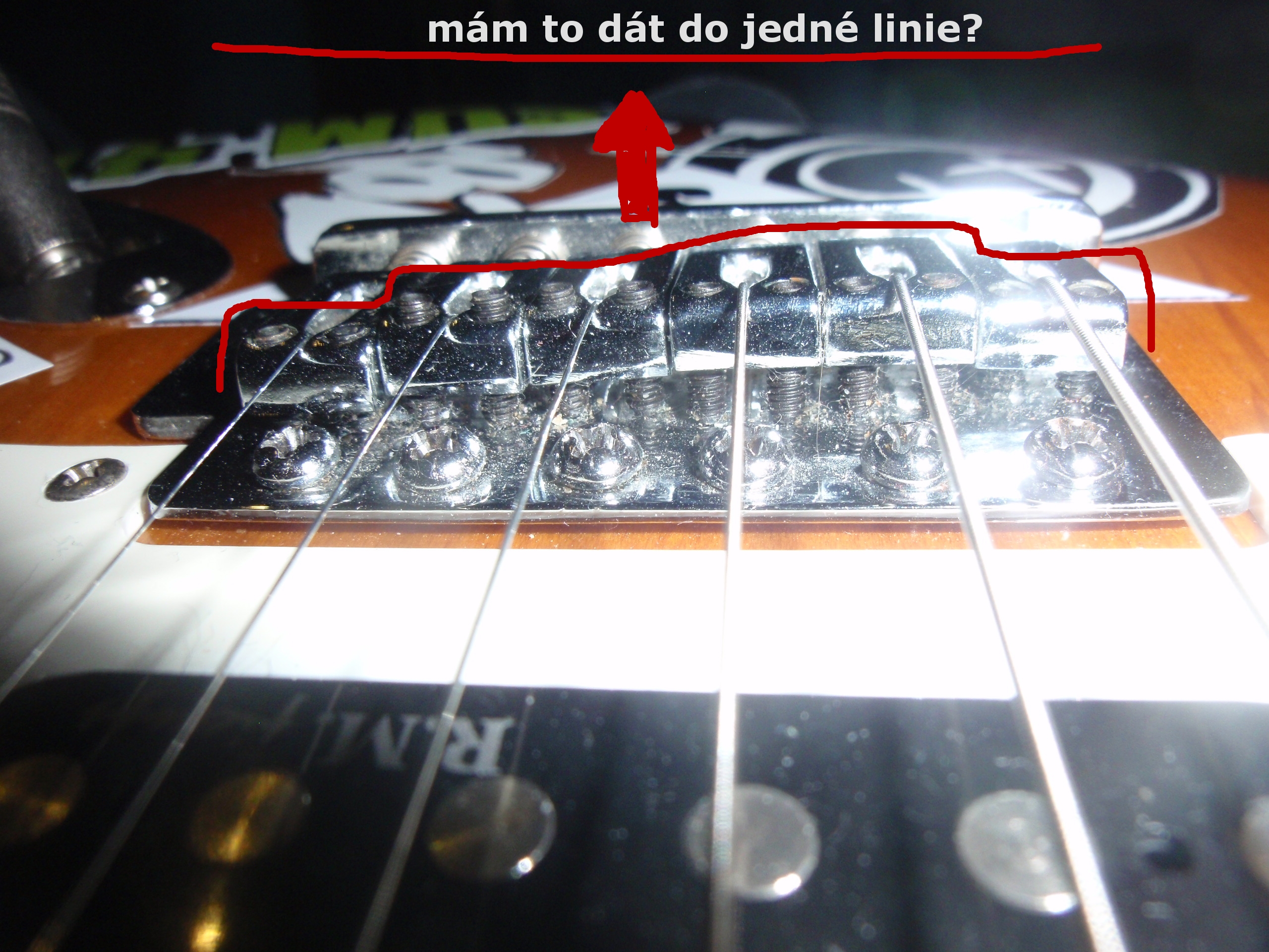 Na té fotce to vypadá celkem správně, jen bych poladil rovnoběžnost kamenů s kobylkou. Tj. oba stavěcí šroubky stejně zašroubované. Schodky tam budou, to je v pořádku. Doladit tak, aby struny nedrnčely o pražce při Tvém stylu hraní.