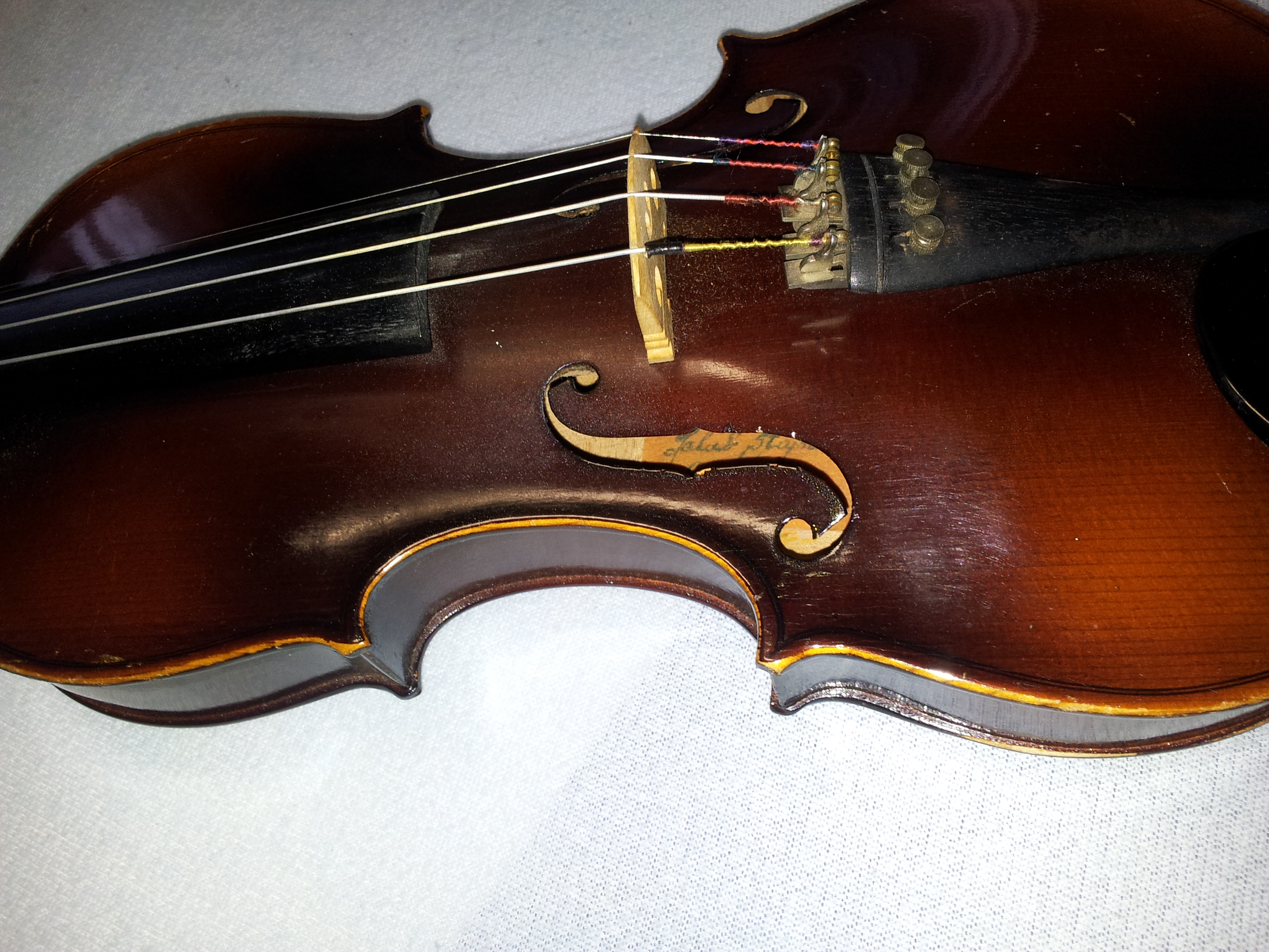 navíc na ní vyleze každý škrábaneček. Naopak zadní deska jakoby k houslím ani nepatřila, má takový medově průhledný lak, narozdíl od horní desky. Lak na horní desce je taky uměle "zestařený" u rohů, hmatníku a v záhybech (to dělá každý houslař podle svého vkusu), na spodní desce ale zestaření není - ty housle klidně můžou být bastl (slepenina) ze dvou nebo více houslí, dělá se to běžně. Opravdu bych ty housle musel držet v ruce, abych řekl kloudný názor, všechno co jsem napsal je jen orientační letmé info založené na 4 fotografiích.