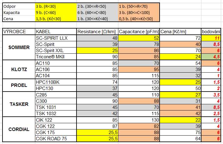 Jelikož mi jde při bodování primárně o zvuk, je zdůležitněna kapacita kabelu, odpor je bodován méně, jelikož v hodnotách, ve kterých se pohybuje nemá na zvuk až tak podstatný vliv. Na druhou stranu nějaké body za něj stále dávám, jelikož nízký odpor kabelu jde ruku v ruce s průřezem jeho jádra (nepřímá úměra) a tedy i mechanickou odolností kabelu. Tedy čím tím větší průřez jádra, tím větší mechanická odolnost a nižší elektrický odpor. Jazýčkem na vahách při výběru kabelu může být i cena, tudíž je k ní při bodování rovněž přihlédnuto.