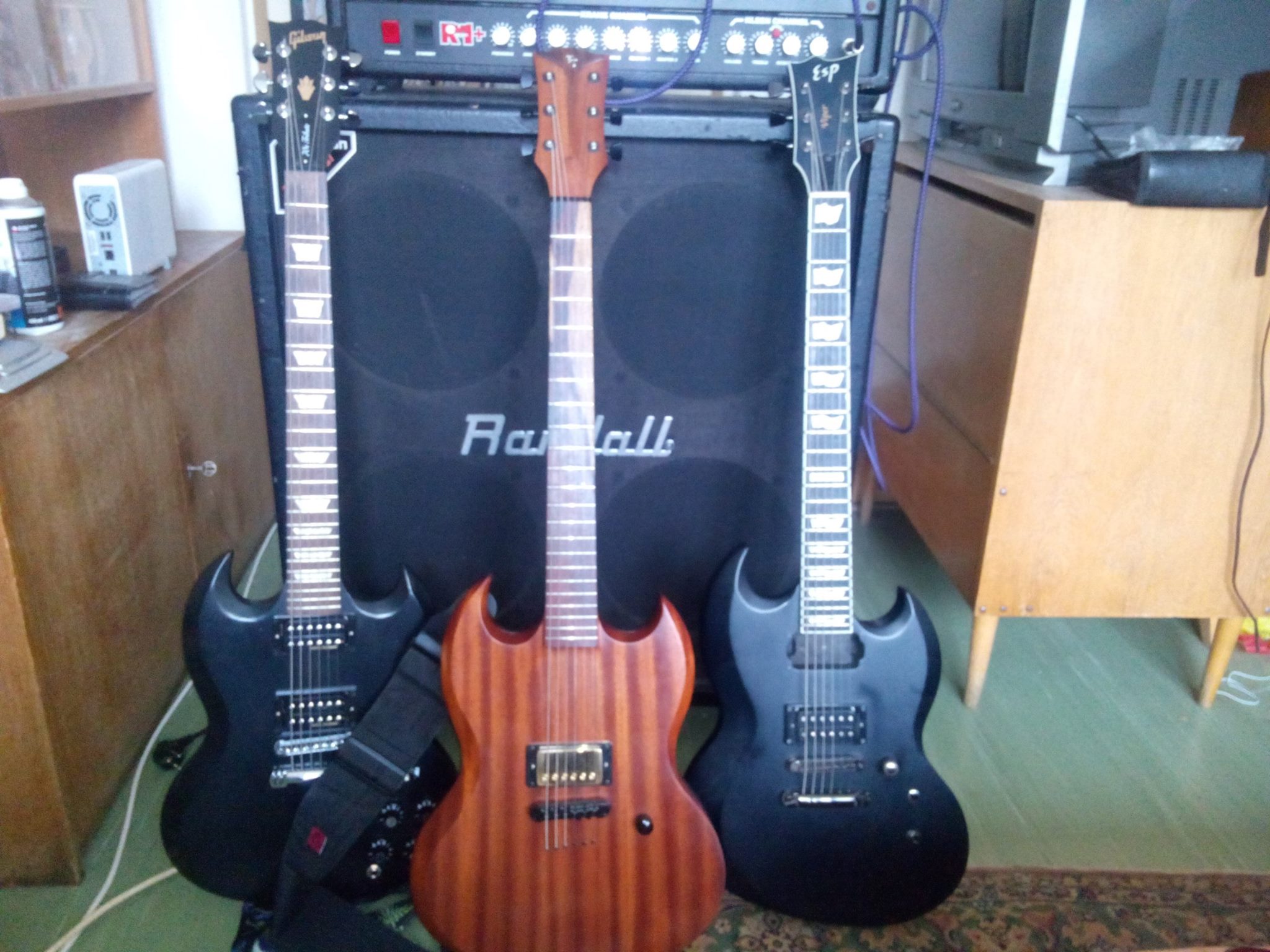 Krank Revolution+1head Box Randall 4x12 Eminence V12 Legend,kytary ESP Viper snímač kobyla Dimarzio Dominion,Gibson SG Tribute SG 70s snímače Dirty Fingers,TTguitars Custom SG snímač BKP Nailbomb Alnico V.