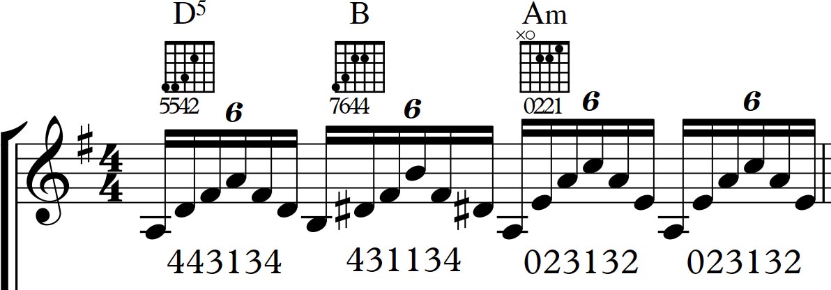 a ještě technická u 2 a 3 taktu a pak i dále kdy jsou na Gečku 4 / 5 pražci hamer on/pull off a pak tam je na Dé struně na 7 pražci další to se má hrát spíše prsteníčkem nebo malíčkem (na struně Dé?