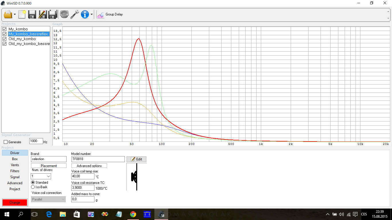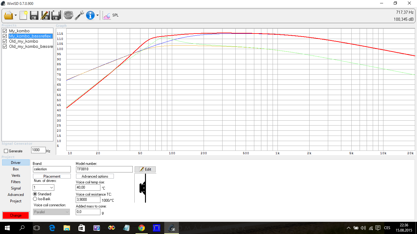 chci měnit reproduktor SAL SBX1620 (50Wrms, 6,5", 87dB/m, 8ohm) za Celestion TF0818 (100Wrms, 8", 94dB/m, 8ohm). Reprobednu chci používat se zesilovačem 100W (trvalý výkon), při větším peaku může mít až 180W). Reprobedna bude mít přepínač HiFi a kytara. V režimu HiFi bude reprobedna dvoupásmová s dělící frekvencí 3,3kHz. V režimu kytara, bude připojen pouze TF0818.