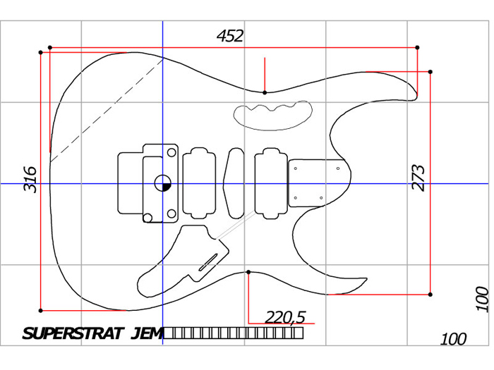 Porovnal jsem rozměry těla Ibanez RG a specs pro Ibanez JEM a z toho jsem sestavil plánek těla v rastru 100 x100 mm. Základní rozměry jsem přidal, ostatní polohy a rozměry detailů se nechají z rastru odvodit. Tlouštka těla je 43 mm, šířka lože krku je 58 mm. Než začneš něco obrábět, měl bys mít kompletní tremolo, krk a snímače k ruce, aby se daly případné odchylky vyrovnat.