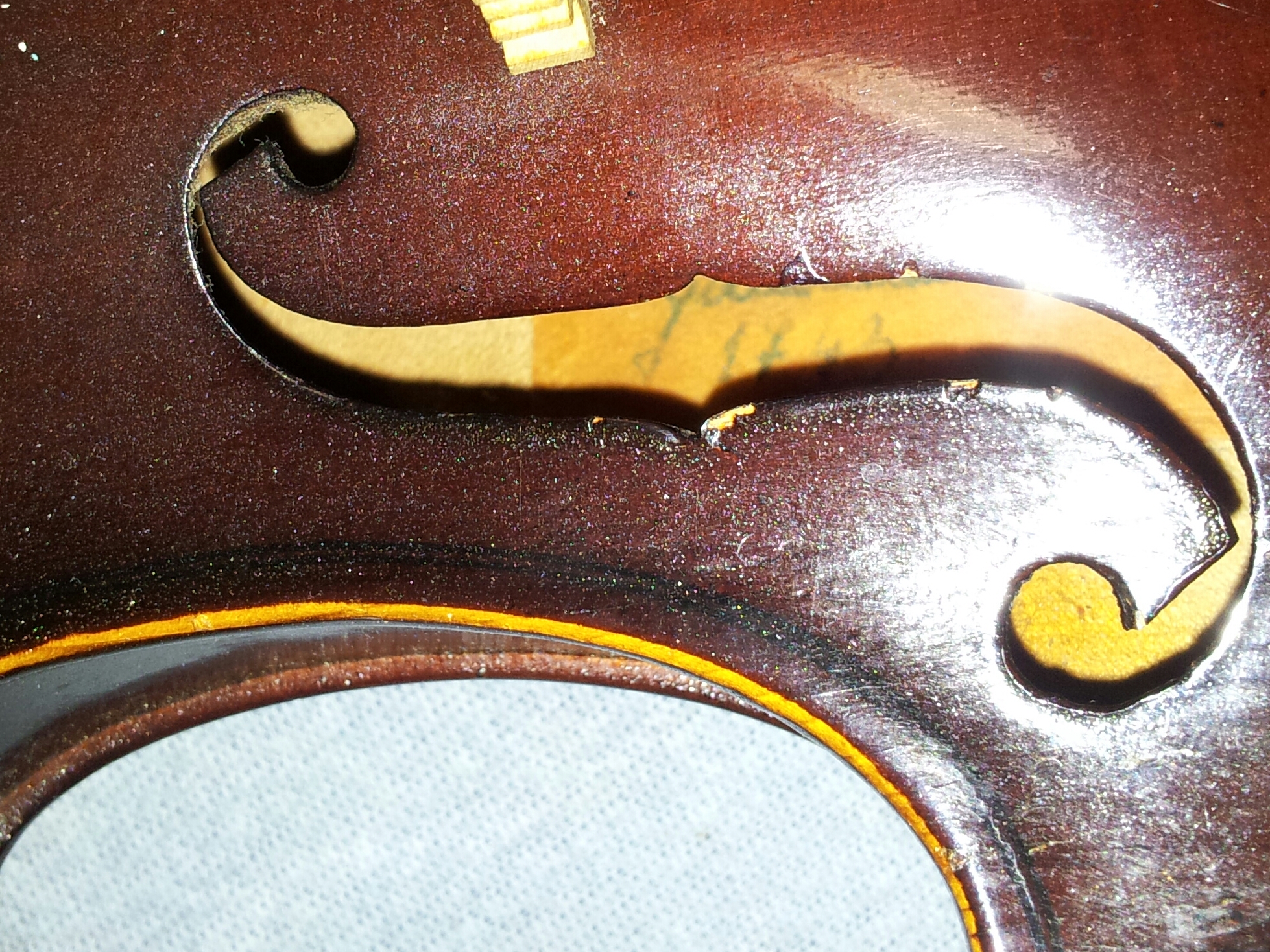 1) Lak není moc kvalitní, na exponovaných místech se loupe. "Tovární" housle vyjížděly v Lubech z "továrny" v různé kvalitě a to se týkalo i laku, ten by měl být spíše ohmataný, ne oloupaný až na dřevo. Je to samozřejmě jen kosmetická záležitost, ale prostě ten lak je z méně kvalitních a nechal bych odkrytá místa určitě zapravit. Určitě bych taky nechal housle očistit od nánosů kalafuny před kobylkou.