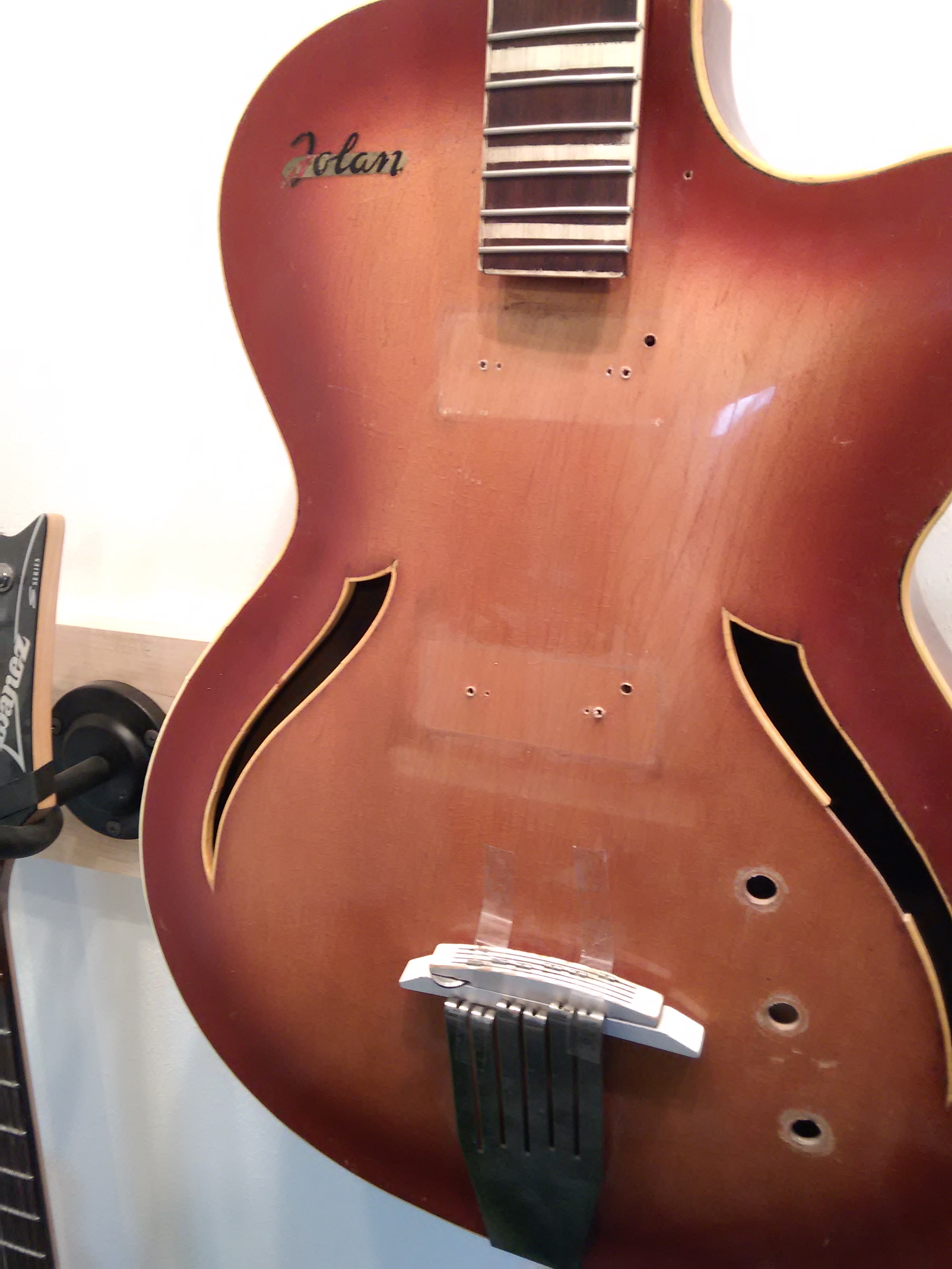 Tak na začátku nebylo nic vidět zubařským zrcátkem. Takže sem skalpelem odkoupl snímač který byl přilepený. Pod ním byly vruty které sundaly kovovou část. A pod tím zase vruty na tu bílou podložku. Nafotím to pro další rádoby " restaurátory" . chtěl bych ty snímače nahradit nějakýma P90kama. Ale to až po novém laků a opravě uložení krku, a opravě samotného krku.