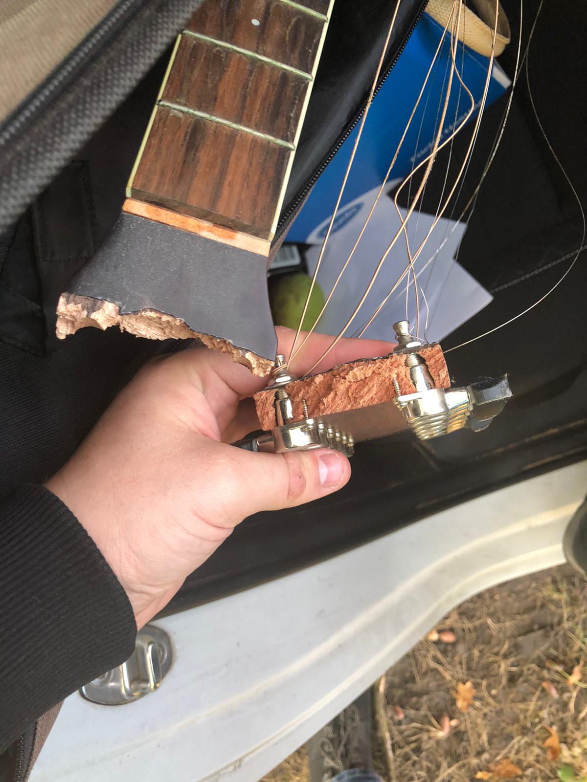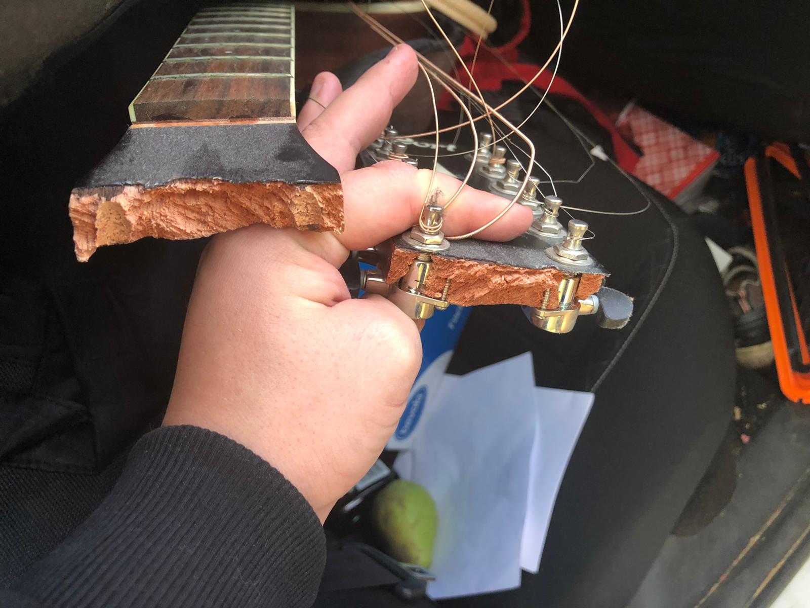 Tohle spravíš poměrně snadno, i když se jedná o nikoliv triviální destrukci s netriviálními následky. Tato část krku je samozřejmě extrémně namáhána tahem strun, které to vlastně ulomit chcou. Mírně se tomu ulomení odpomáhá právě sklonem hlavy, tak, že se namáhání mění spíše na tah, resp. na tlak, místo čistého lámání. Materiál byl zřejmě příliš řídký, možná se mu pomohlo i malým "poklepáním".