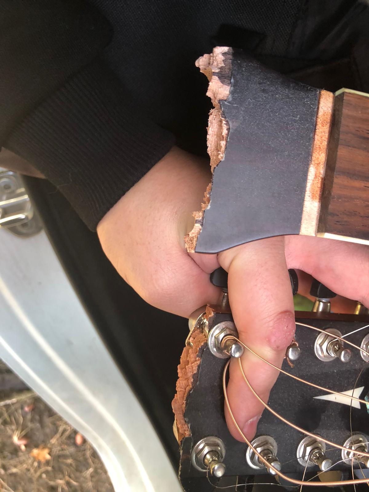 Cha, tak to znám velmi dobře. Přesně tohle postihlo kámošovu Epi Special. To není tragedie. Slepil jsem mu to 2 složkovým Lepoxem, vyštípanou dýhu na čelní ploše jsem zatmelil týmž s přimíchanými pilinami. Ne, nevypadá to profi, ale vlastní slep na zadní straně kde se opírá palec je naprosto čistej a hlava drží jak židovská víra. Je jen na pracovitosti a píli, jak moc chceš takovou opravu dofinišovat.