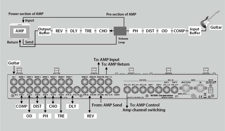 BOSS ES 8 slouží k tomu, aby jsi nemusel "tancovat" po krabičkách...vše mas propojeny s ES a tam si to naprogramujes dle libosti... takže vyradis klasickej footswitch a připojiš to tady...když si uděláš patch například zkreslení z hlavy + overdrive nebo clean z hlavy + reverb, tak to zkrátka potřebuju nějak propojit...koukni na nějaká videa jistak