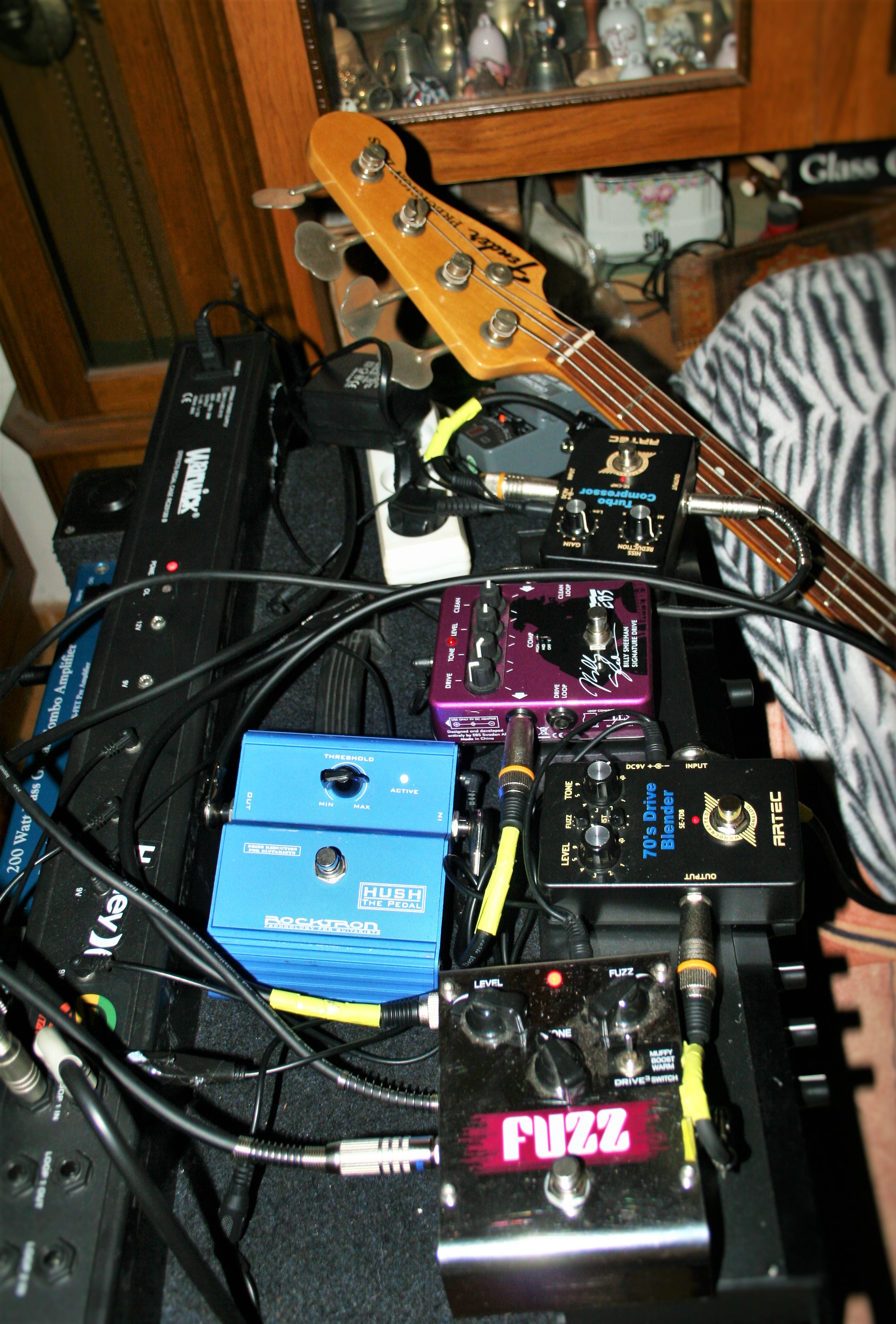 Sice to je reaktivace po čase, ale je to k věci. Tenhle drátistán je moje domácí houmcvičba. Neni tam ani jeden efekt přes 2600 mimo Sheehanova mixdrajvu. Takže se dneska nechá vybrat hodně věcí za podstatně míň, za dva šest si člověk složí jak drajv, tak obyč kompresor tak k tomu fuzz nebo něco dalšího. Jenom bych řek, že je dycky třeba počítat s nějakým noise gate, a na tohle kombinování a pohrávání je skoro jedno kterej to bude, hlavní je dostat z toho trochu ten brum před druhym zkreslenim, a pak už to de