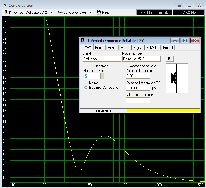 Pro názornost obrázek v příloze - co se děje s výchylkou membrány v 115l boxu laděném na 40Hz s 2x DeltaLite-II 2512 při 575W.