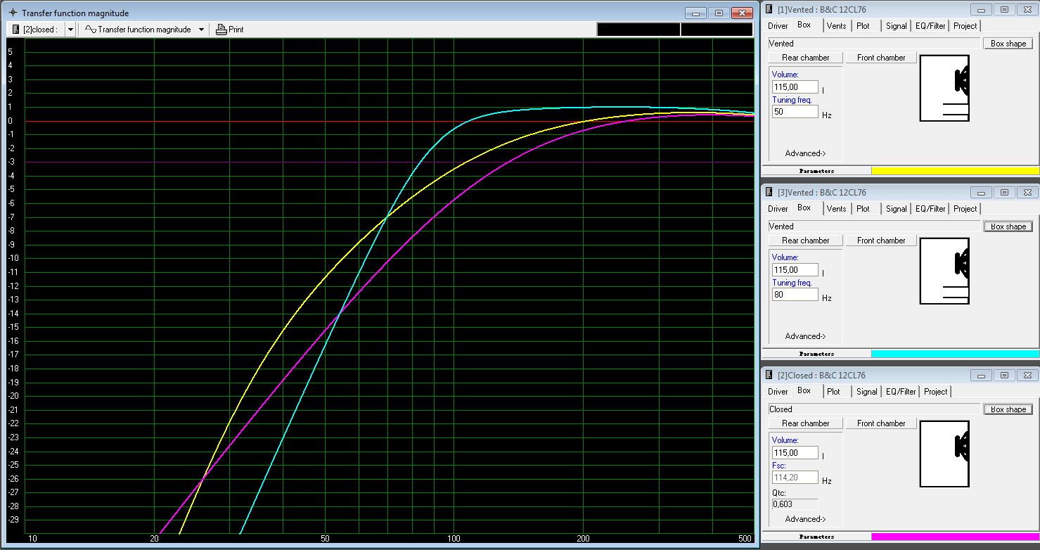 1 - žlutá - Vyladěno na 50Hz, hloubka basreflexu 4,7cm. Cone excursion v pohodě, pokles -3db už od 200Hz.