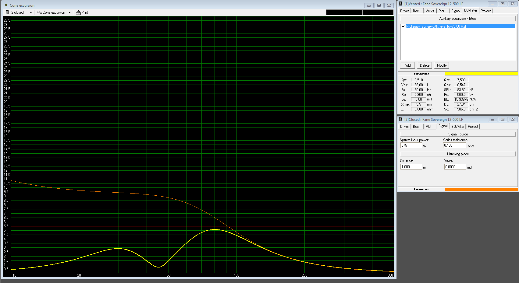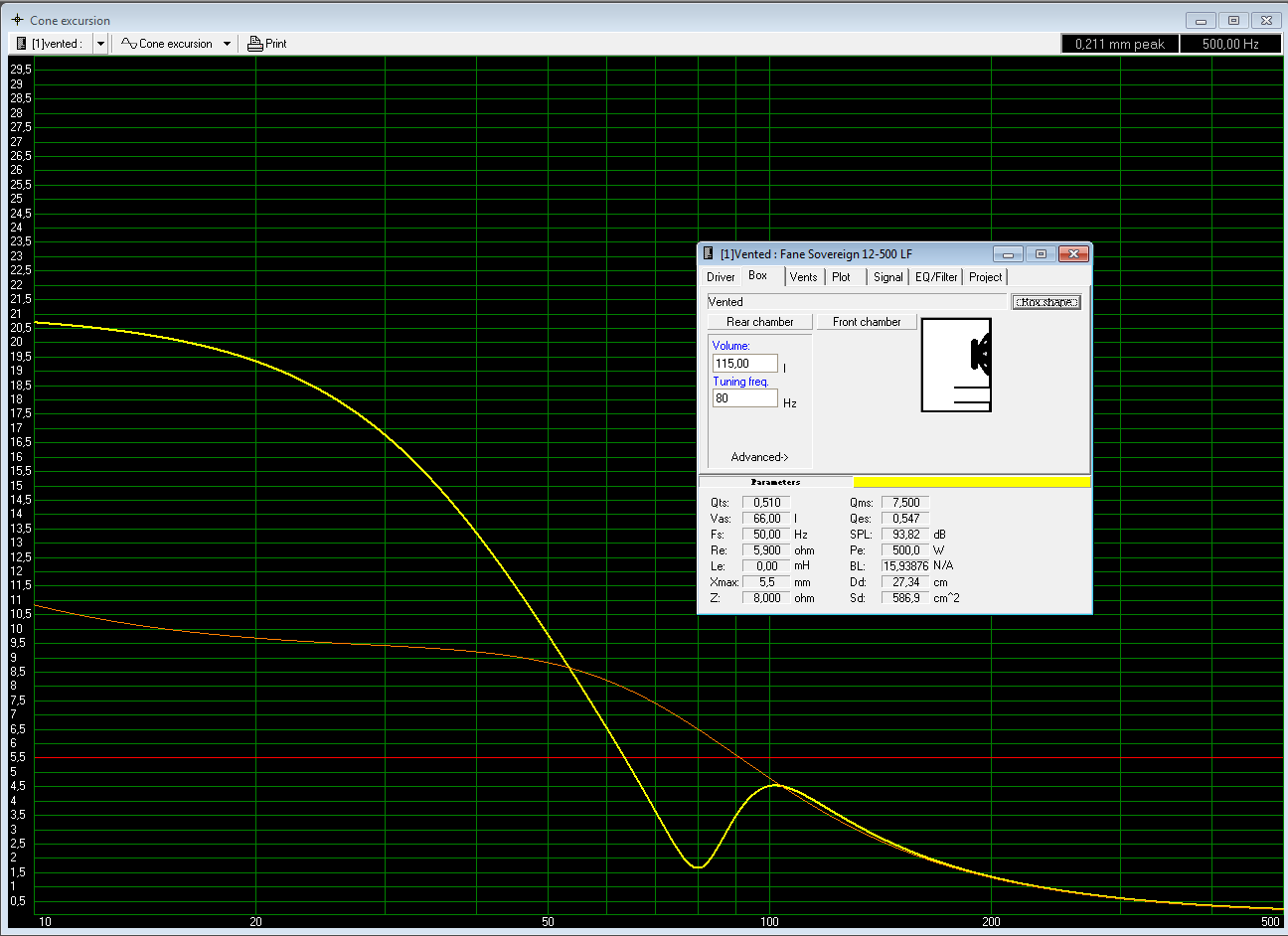 Pro názornost obrázek v příloze - co se děje s výchylkou membrány v 115l boxu laděném na 40Hz s 2x DeltaLite-II 2512 při 575W.