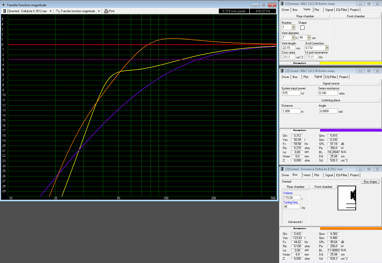 Jaké TS parametry jsi použil pro 12CL76? Ty ze stránek Prodance, WinISD, datasheetu nebo měření Prodance? Výsledky se pak můžou hodně lišit. Výsledky tvé poslední simulace se mi totiž nezdají.