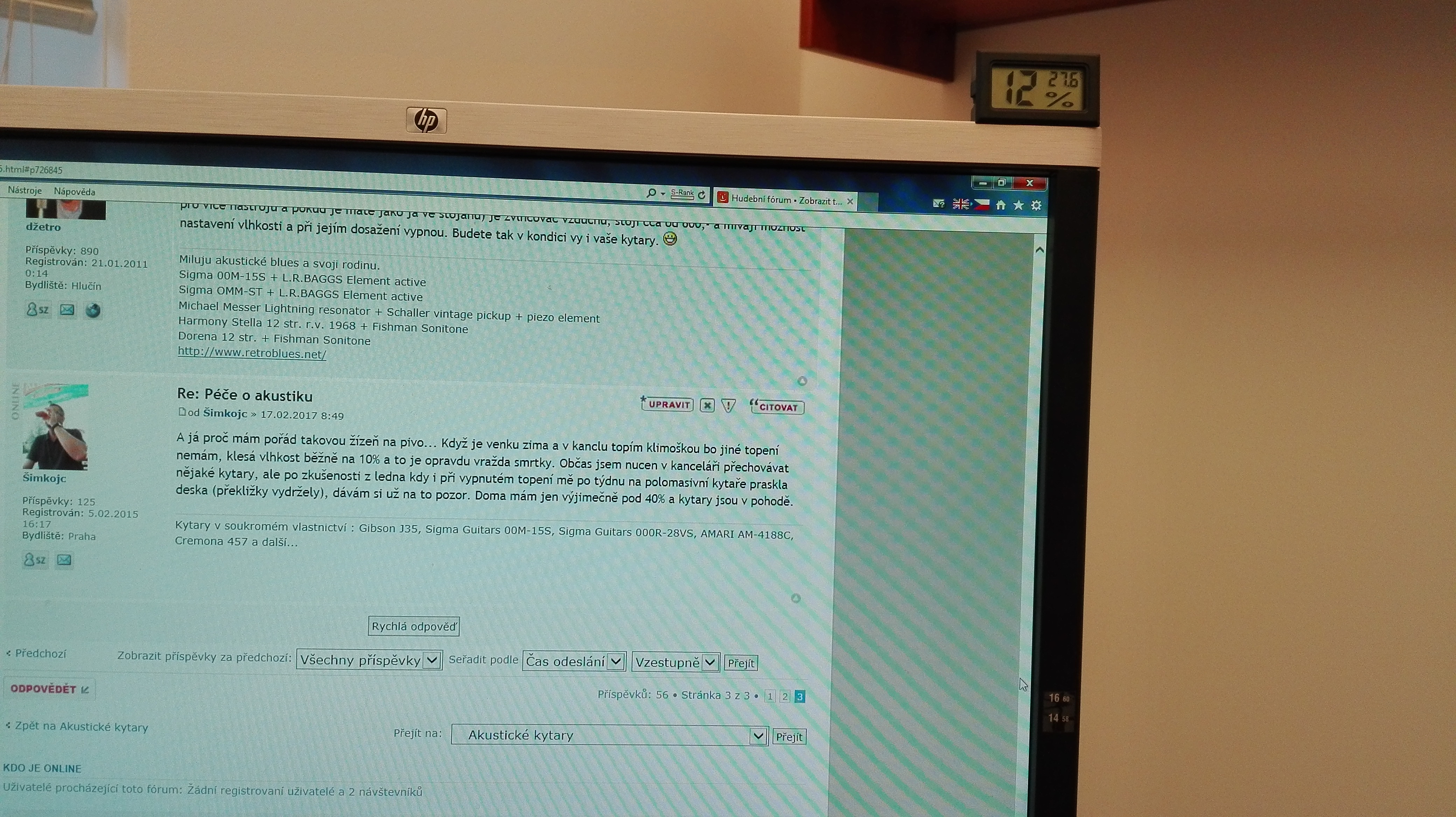 A já proč mám pořád takovou žízeň na pivo... Když je venku zima a v kanclu topím klimoškou bo jiné topení nemám, klesá vlhkost běžně na 10% a to je opravdu vražda smrtky. Občas jsem nucen v kanceláři přechovávat nějaké kytary, ale po zkušenosti z ledna kdy i při vypnutém topení mě po týdnu na polomasivní kytaře praskla deska (překližky vydržely), dávám si už na to pozor. Doma mám jen výjimečně pod 40% a kytary jsou v pohodě.