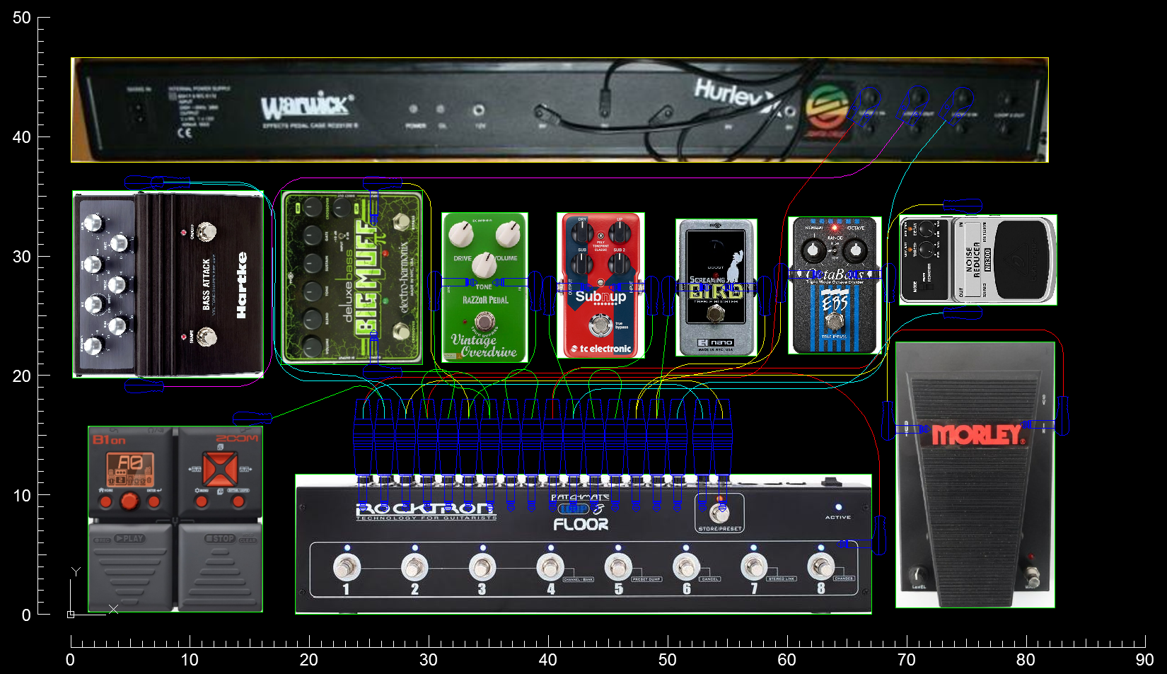 TC Sub 'N' Up, Zander Circuitry SiClone Fuzz, DOD Carcosa, BOSS CH1, Razzor Delay Box, BOSS RV6