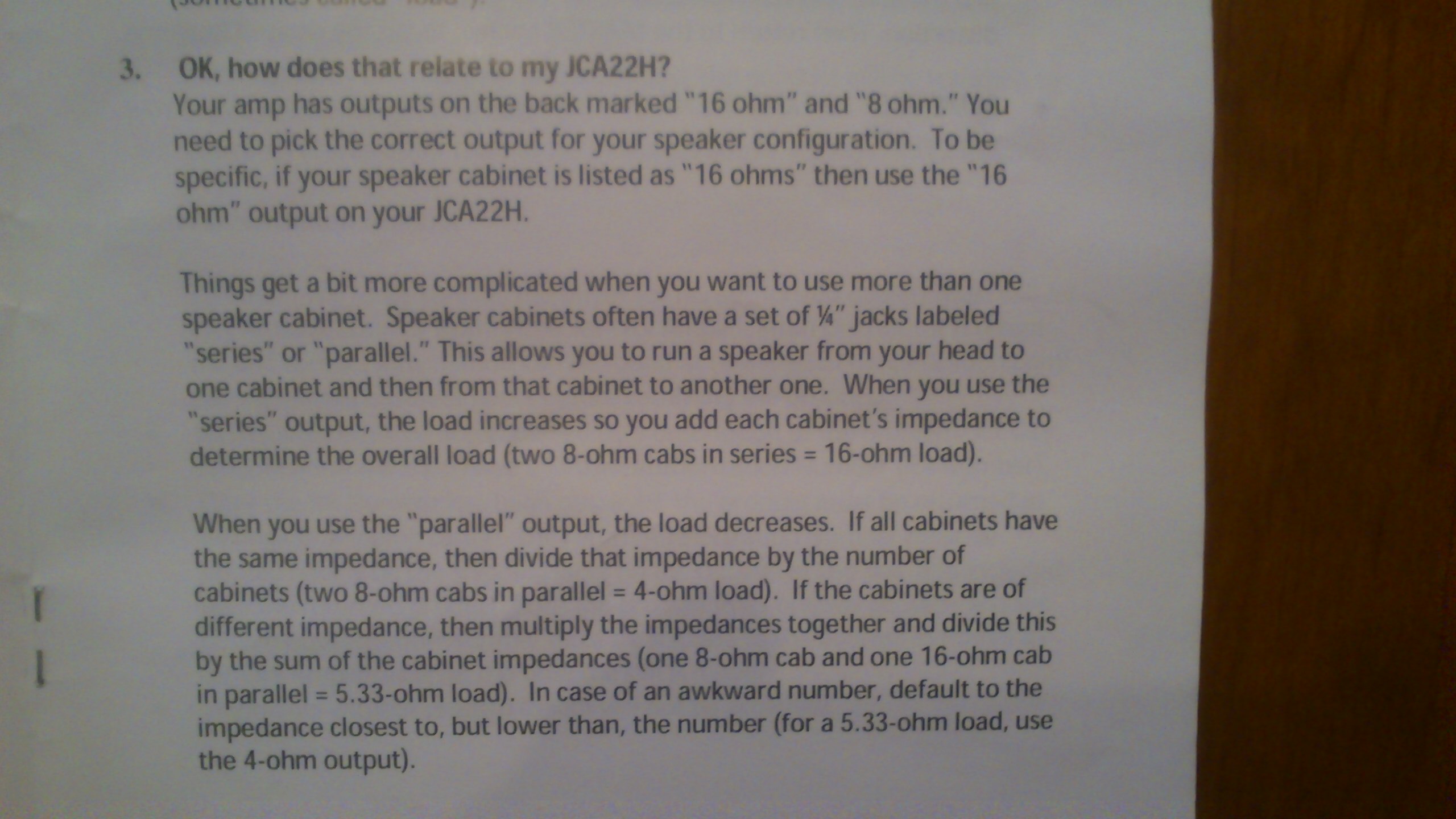 Zdravím pánové, pročítal jsem to tu a chtěl bych poprosit o radu. Mám zesilovač Jet City jca22h. Vstupy na reprobox 1x16ohm a 2x8ohm. Co jsem se tu dočetl tak zapojení docela chápu, ale jediné co nevím je jestli mohu současně mít zapojený box 1x16ohm a 1x8ohm. Přikládám foto textu z manuálu. Moje angličtina je na úrovni googlu takže nic moc. A ještě přikládám foto schématu. Předem děkuji za odpověď.