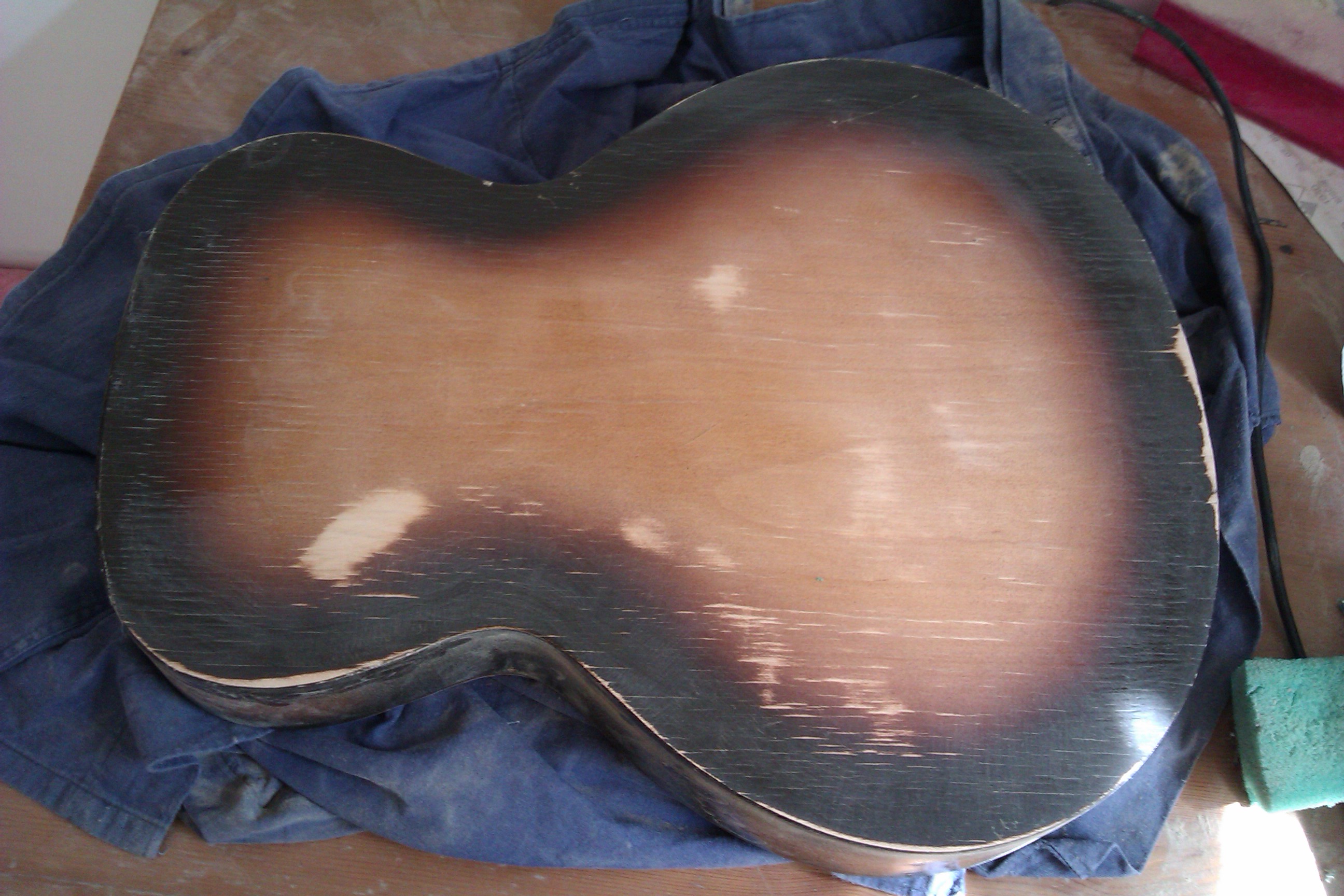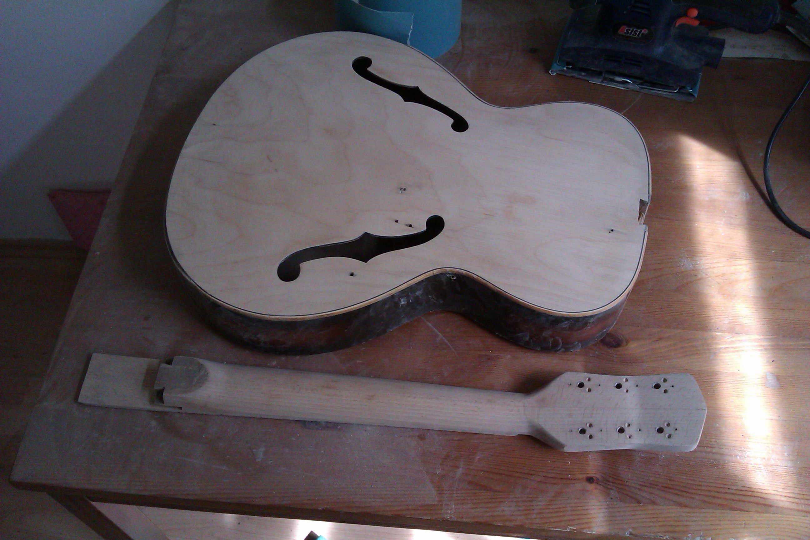 Ahoj, mám v plánu rekonstrukci. Za 600 jsem koupil rozloženou Gibsonku. Krk a tělo zvlášť + orezlý strunník a pickguard s šedočervenym kolečkem (zbytek potenciometru). Kytara měla popraskaný lak místy zničen nějakým lepidlem. Plán mám následující:
