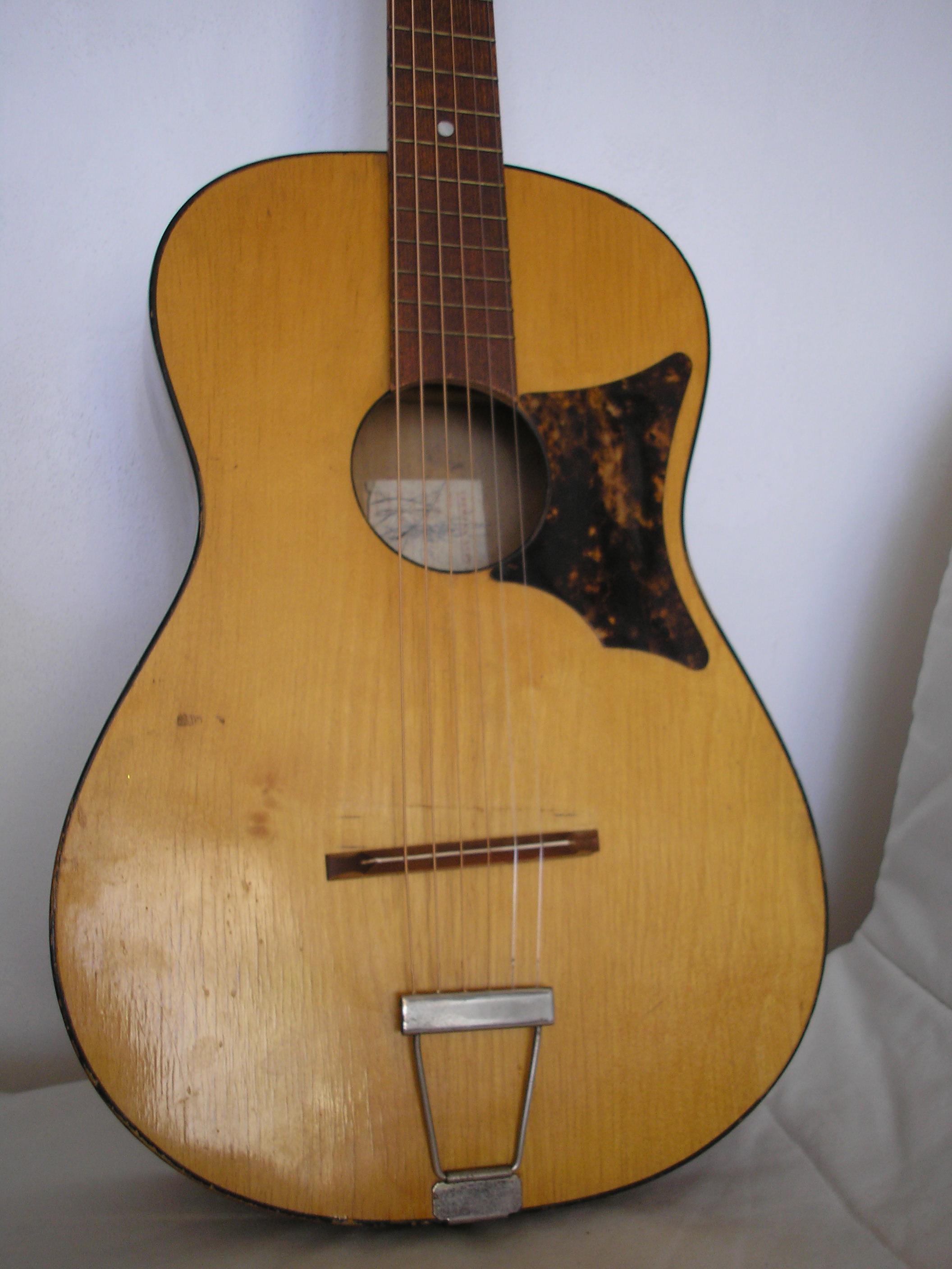 Tenhle typ byla moje úplně první kytara. Tehdy čundr pádlo dnes folková kytara - mrkev v zimě ... :) . Ze sentimentálních důvodů pokukuji po nějaké zachovalé a v původním stavu na zeď. Ale tahle je silně napadená kutilem. Mj. krk lepilo prase a ten home-made sunburst je taky otřesnej.