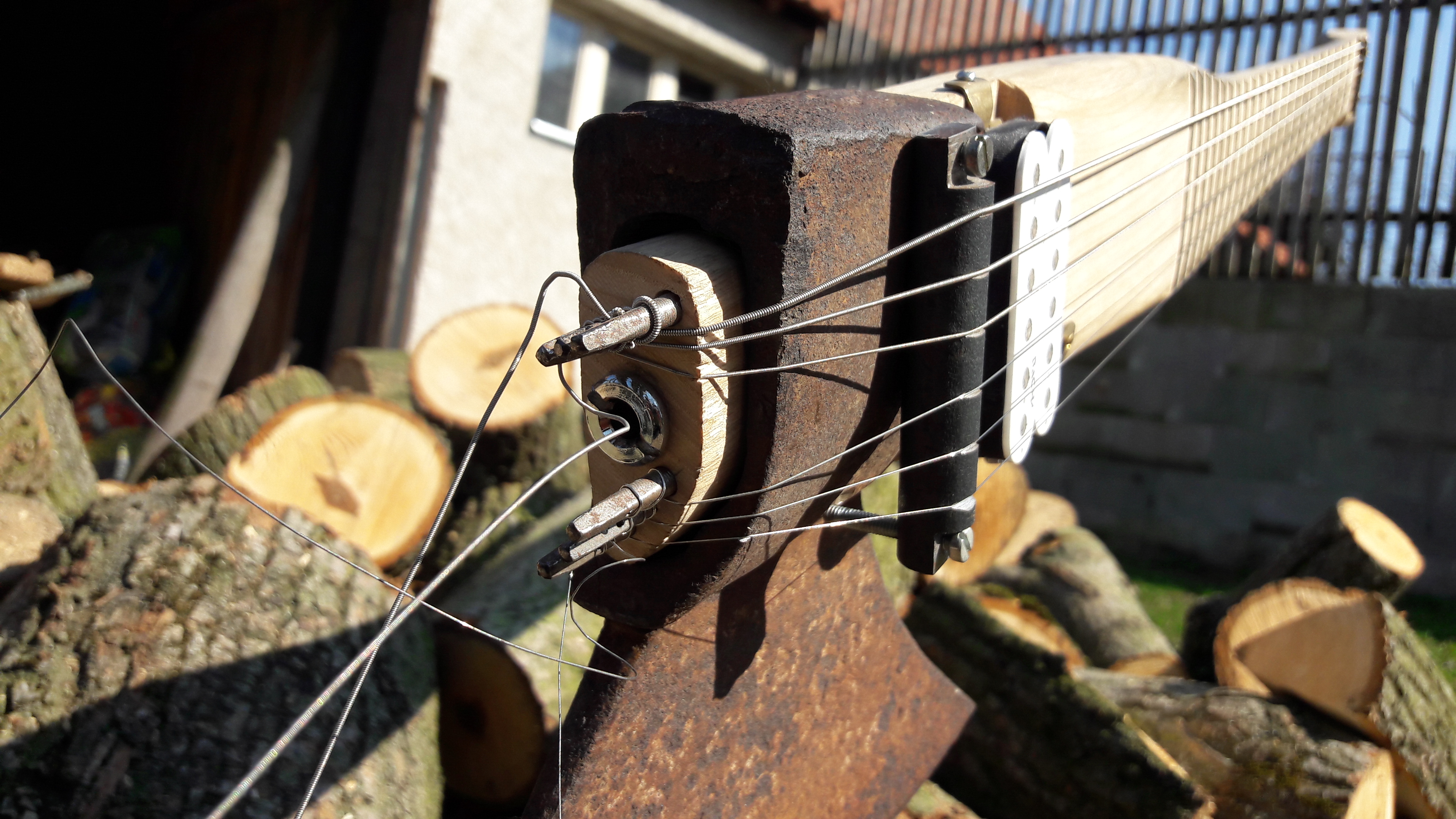 Původně to měla bejt kytara z jakéhokoli nářadí. Nejdřív byl v plánu rýč, ale pak mě napadlo tohle a nějaký to želízko se tu taky válelo.