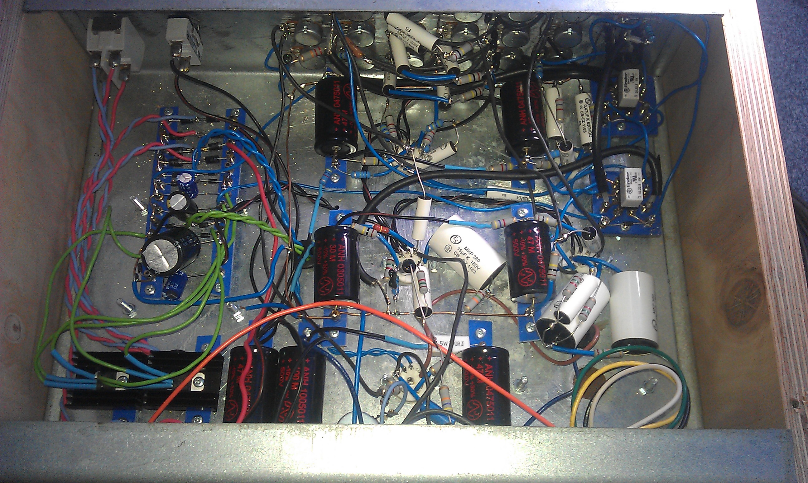 Koukám, že jsem zapomněl na stíněný kablík mezi první a druhou elektronkou. S dlouhými propoji mám problém od začátku, co tohle dělám, vždycky to vypadá, že je tam hodně místa a nakonec nevím, kam dát relátka.