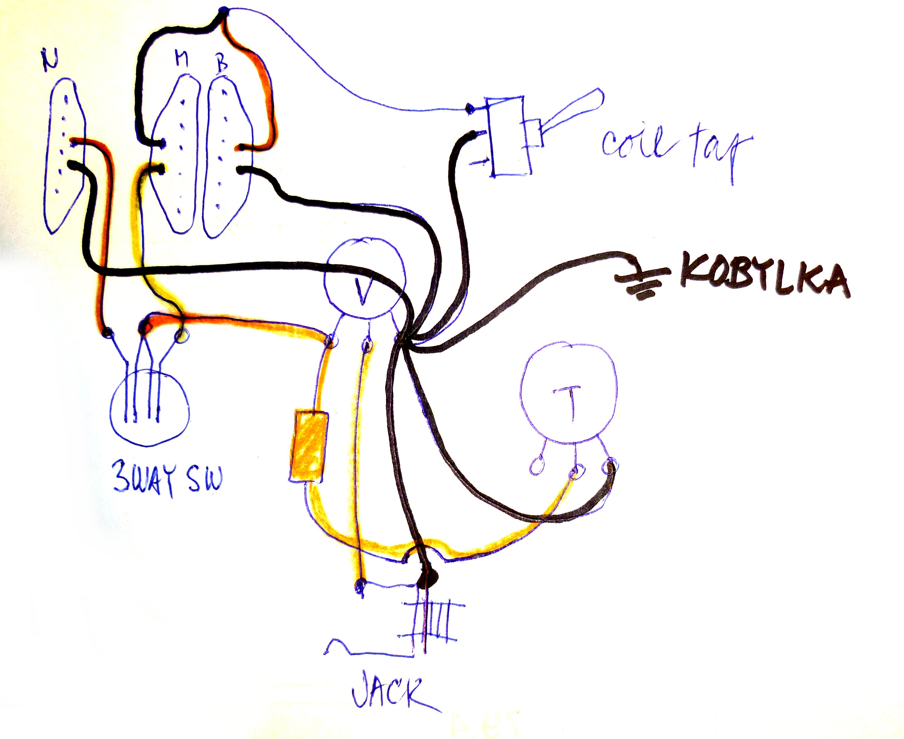Co tohle? Pomůže? Coil tap je tak, aby to v mezipoloze B+N nebmrumělo. Barvy si domysli, bílou nemám, místo té je červenohnědá. Kondík poznáš.