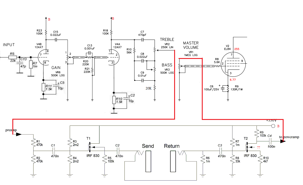 Výstup z prvního IRF830 má danou sílu výstupu, kterou nejsi schopný regulovat. Pokud bude signál moc silný, přebudí druhý IRF830 nebo některou z krabiček. Tonestack a dělič ze dvou 470k odporů signál srazí, může to být taky moc potichu a nijak to neovlivníš. Nahradil bych ten odporový dělič 1M potem.