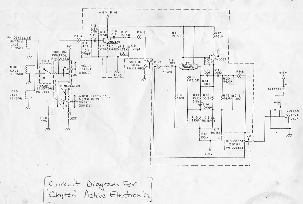 Heleď... tohle schéma není nereálný. Jen bys musel zjistit, jak je zapojenej ten Claptonovo mid boost (kdysi jsem to hledal a moc se toho vykoumat nedá). Všechny ty potenciometry a přepínátka jsou realizovatelný (byť pomocí stereo potů), ale podle mýho bys narazil v tomhle bodě:
