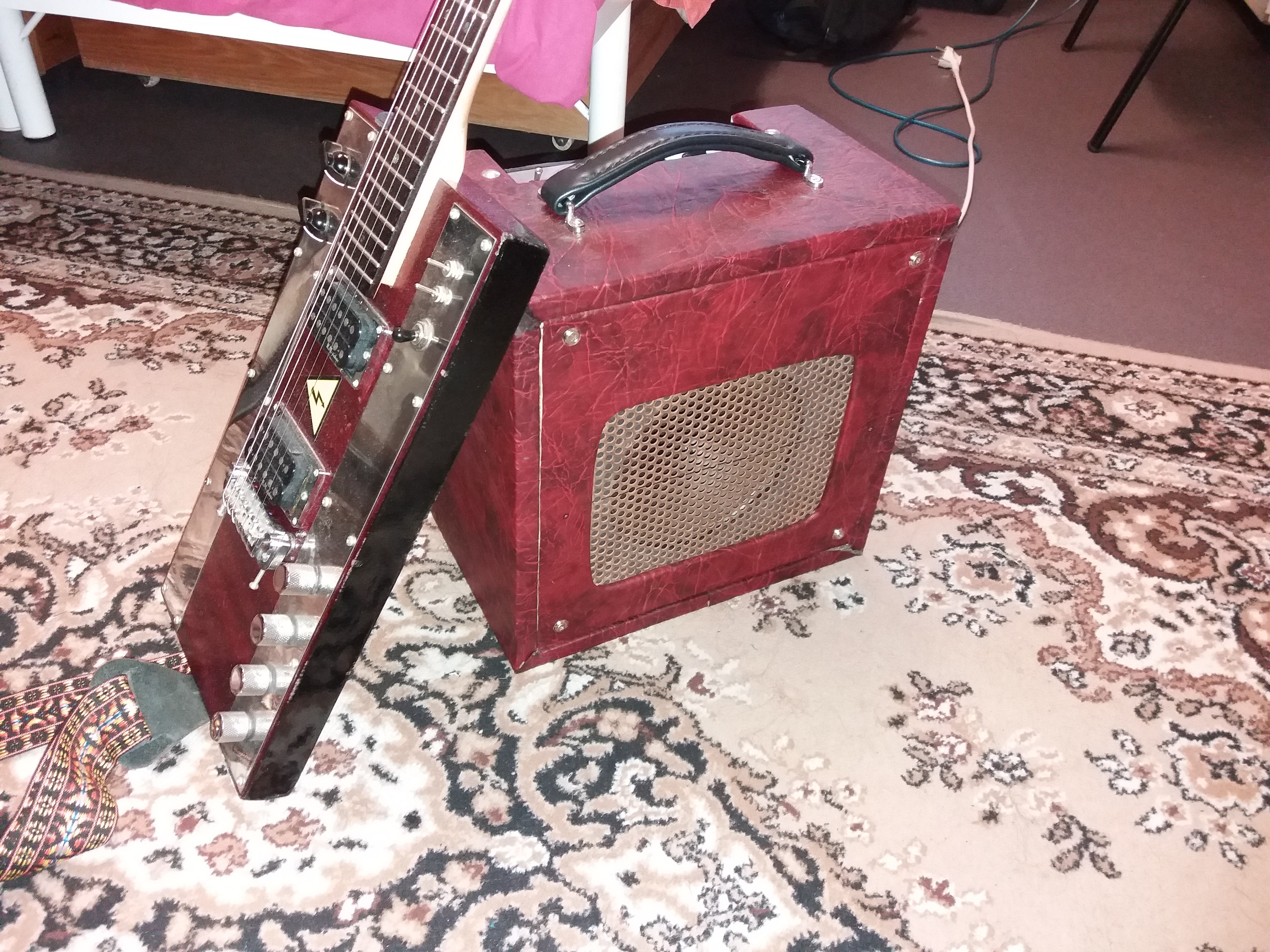 Osazení 1x EL84 v konci, 1x ECC83 v preampu, EZ81 a tlumivka 5H ve zdroji, repro Tesla 4Ohm (typ už nevím a jsem línej to otvírat)