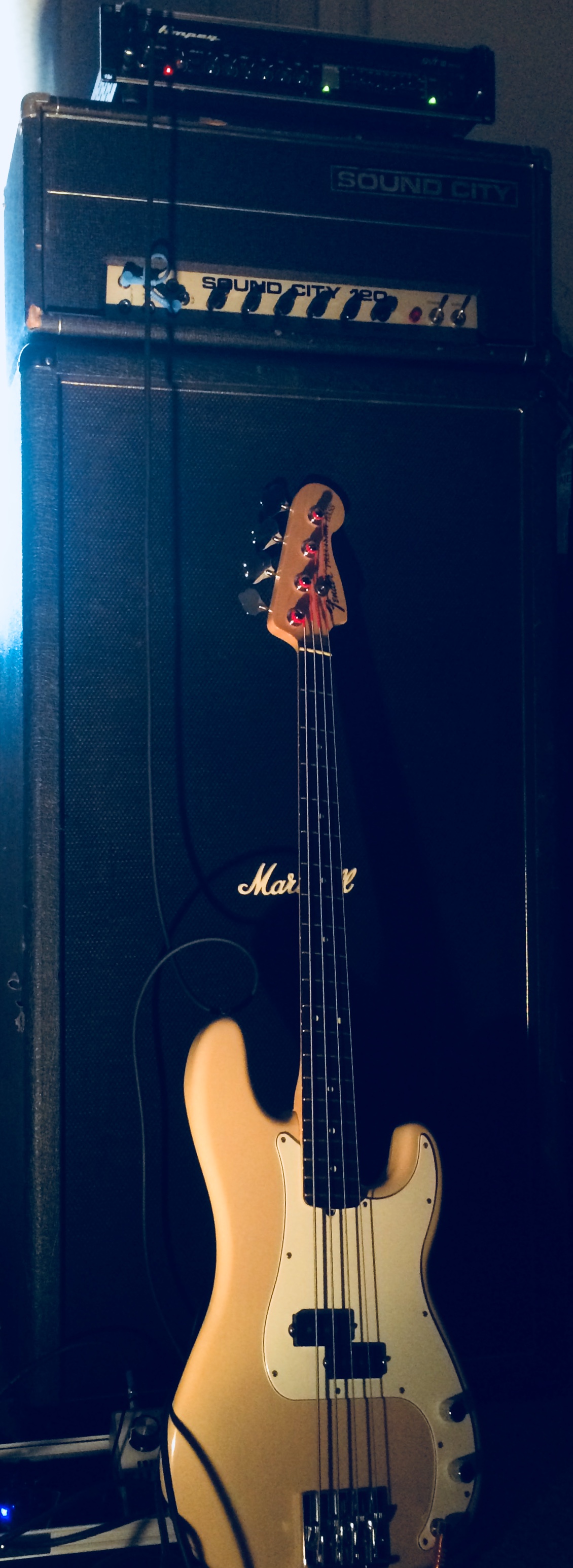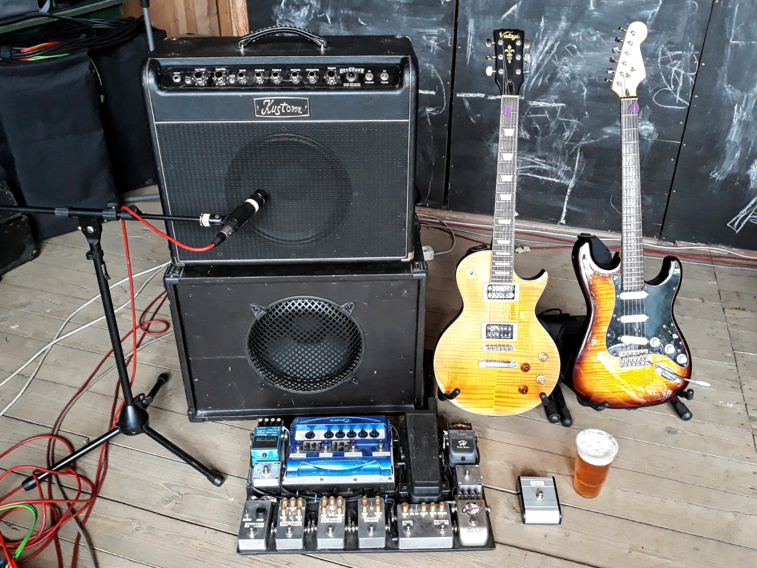 Gibson SG Firebrand 1980, Gibson LP Special 1996, Gibson SG Junior 2011, Miles Steelcaster 2019, Fender Telecaster Standard 1989, Splawn Competition, Fender Bassman Silverface 50w, 1974, 2x12 Custom Coffee Cabs (V30 + Creamback),