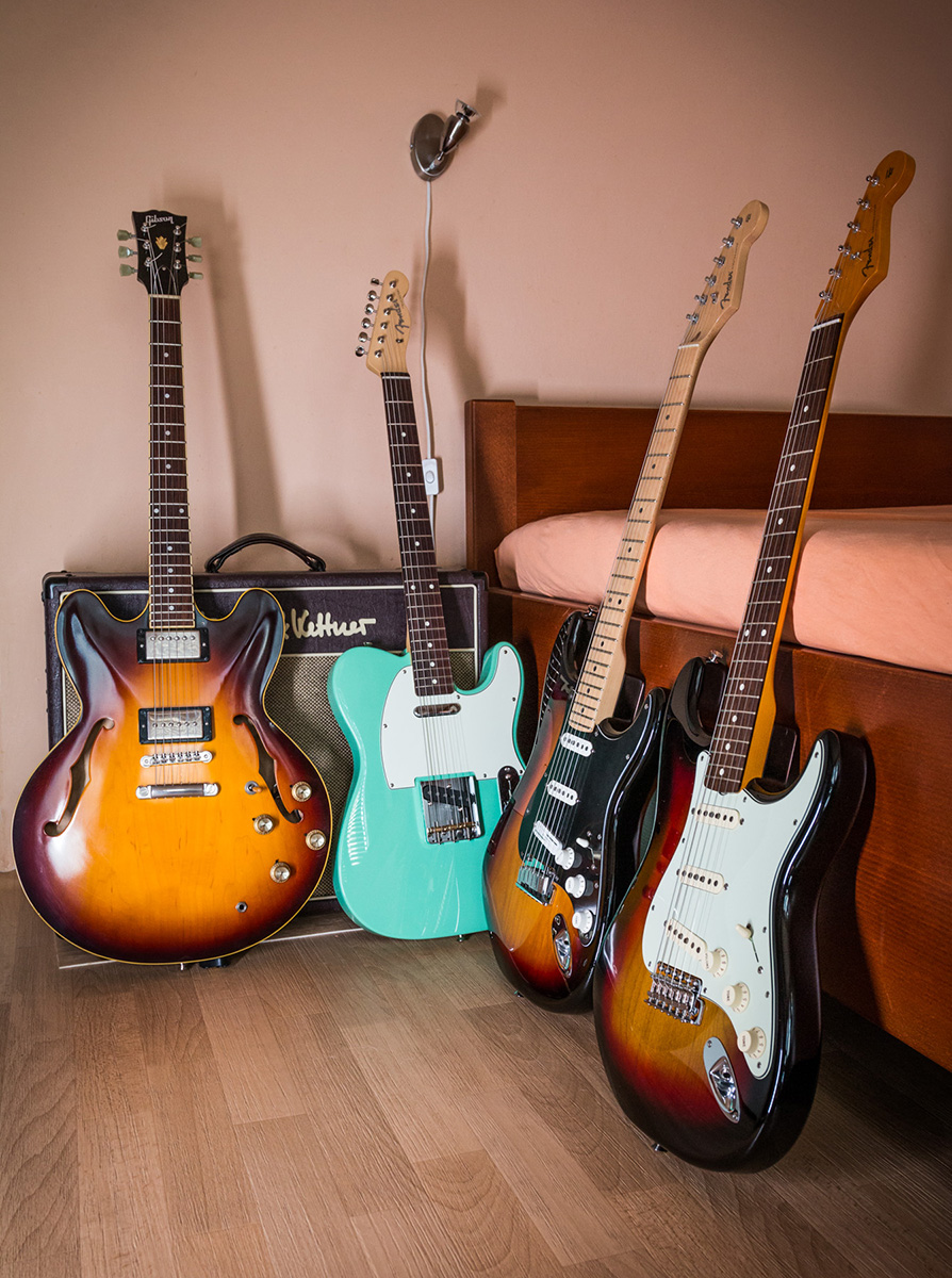 2018 Fender Hybrid 60s Telecaster - nejmladší přírustek, takový zajímavý kompromis mezi klasickým zvukem (USA vintage 58 snímače, klasický popelník s mosaznými válečky) a moderní hratelností (plošší radius, nenápadné zamykatelné mechaniky, 4polohový přepínač). Je to asi nejuřvanější tele, na jaké jsem kdy hrál a zároveň nejlépe zpracované (made in Japan). Je to výborná kytara, ale také jsem si díky ní uvědomil, že vintage komponenty nejsou nic pro mě, takže ten vintage popelník s 3 válečky poletí pryč a dám tam něajaký moderní bridge s 6 kameny, stejně tak asi nahradím kobylkový snímač nějakým minihumbuckerem, který zvládne velkou porci fuzzu bez protivného pískání.