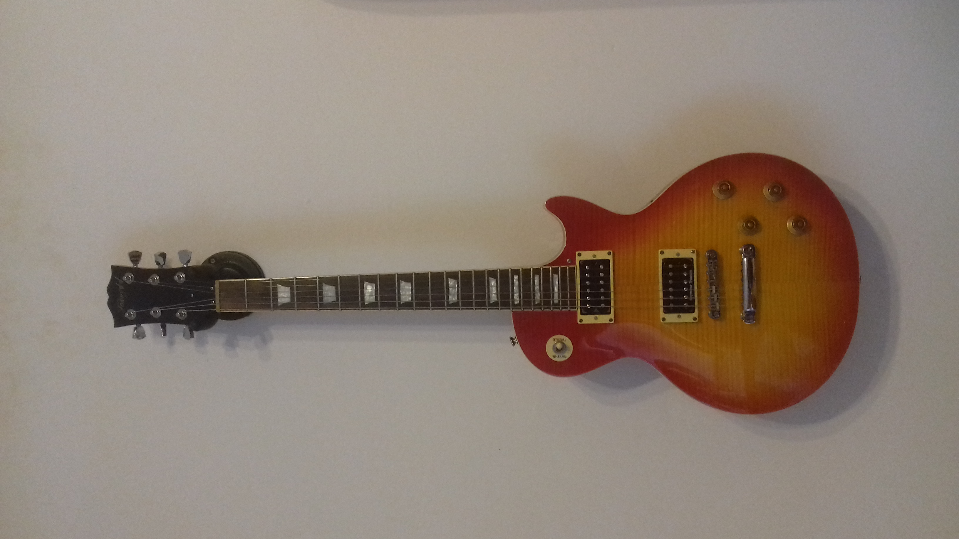 Vybrán ze čtyř kusů přímo v Třebíči, srovnatelný s Epiphone. Snímače vyměněny za Seymour Duncan '59+JB