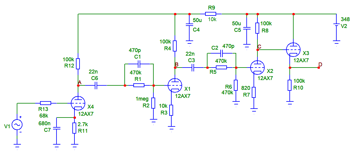 Všimnul jsem si, že na grafu se schématem chybí první trioda. Bez ní je logické, že se nelinearita druhé triody projeví minimálně a třetí se při slabých signálech nepřebudí.