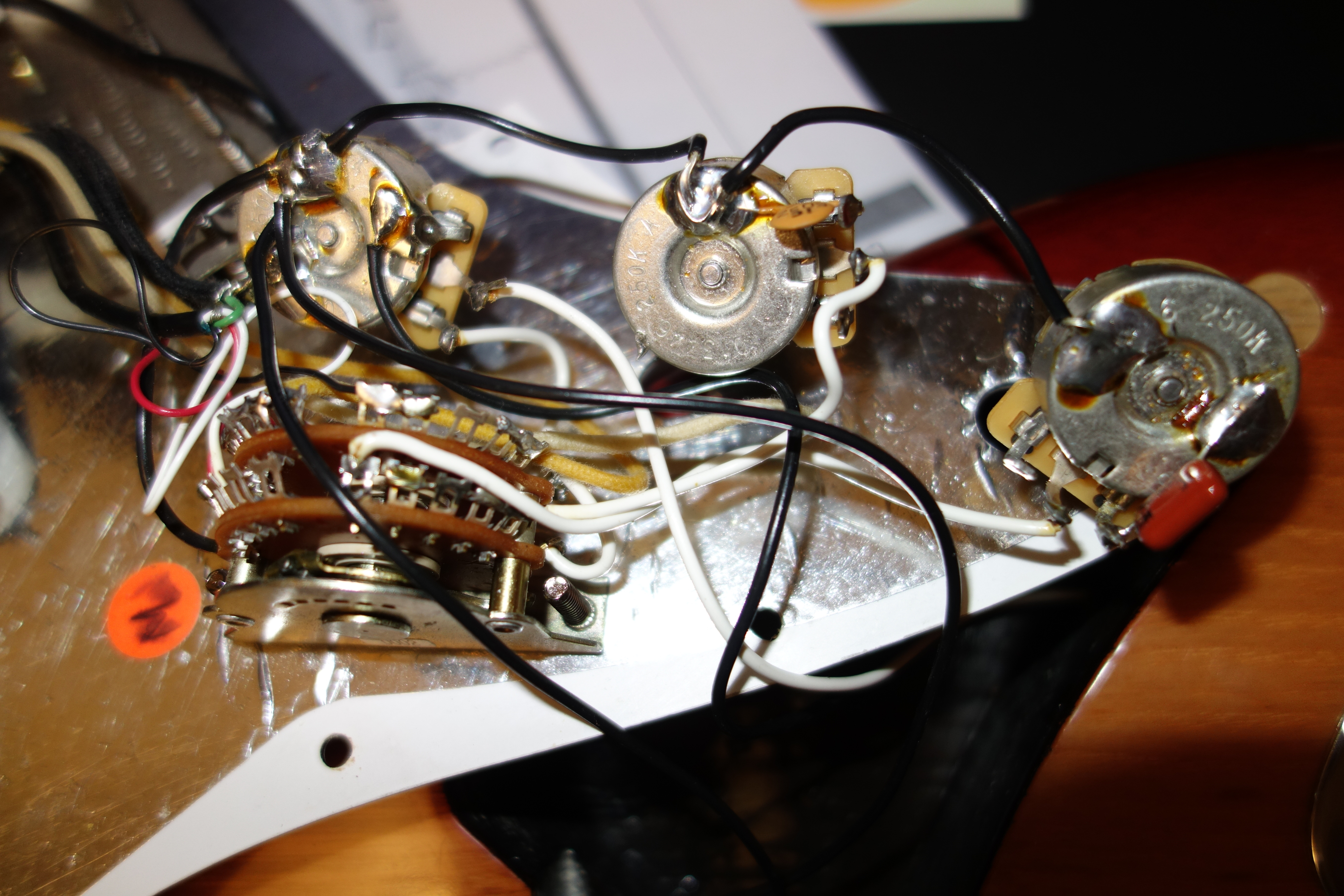 Chyba je určitě v zapojení megaswitche, jehož využití je samo o sobě nadbytečné. Vede někam spodní bílý drátek nejblíž šroubku switche? Měl by jít na levou nohu volume potu. A stejně bych to celé přeletoval.