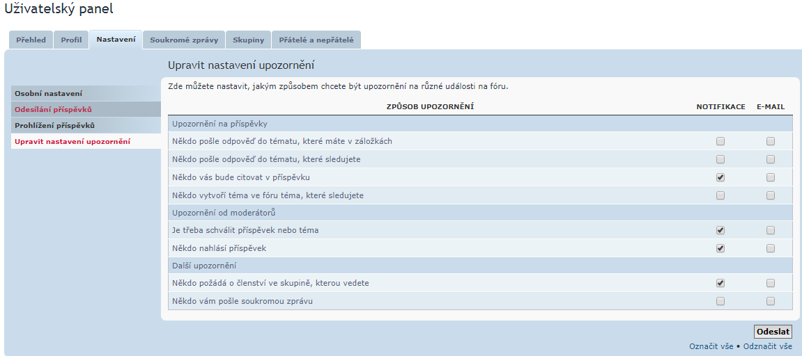 Stejně tak lze notifikace mailem nebo jen na fóru nastavit v uživatelském panelu -> nastavení -> upravit nastavení upozornění. Lze mít jak mail+upozornění, tak jen upozornění, nebo jen mail, nebo klidně nic.