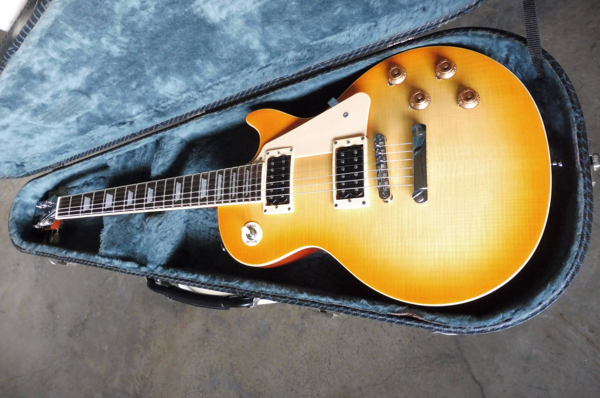 Upgrade: Snímače jsem nahradil SD APH-2 Slash set (z Bazaru za 2800 Kč). Elektronika předělána na 50s wiring. Chtěl jsem upgradovat poťáky za Gotohy (A/log/audio 500k, velké), koupil je v Aleximu ... A ony tam nepasovaly. Jednak jsem musel malinko protáhnout otvory vrtačkou, byly o zlomek mm těsné. A pak jsem zjistil, že mají krátký závit, javorový top je tlustší než na Epině. Na frézování nemám nástroje a nechtělo se mi kytaru nikam nosit, tak jsem dal 2 původní poty a 2 zbylé z Epiny po obdobném upgradu elektroniky, všechny z tónových clon (na volume byly na HB i Epi původně B/lin/log). Původní keramické kondíky (47 nF, to bylo původně i na Epi) jsem nahradil svitkovými 22 nF (mám doma sice Orange drop, ale poté, co je tu mmjuz tak pohaněl, jsem dal Tesly, které mám i na Epi). Switch jsme nechal původní, kabeláž nahradil vintage kabelem od Bacha. Jenže 1 m ho bylo málo, takže od jacku k přepínači (nechal jsem oboje původní, jsou IMHO v pohodě, lepší než na Epině) jsem použil zbytek kytarového kabelu, který měl taky cínované stínění (odstranil jsem z něj izolaci, aby byl tenčí a prošel, a samozřejmě aby vypadal víc "vintage"
