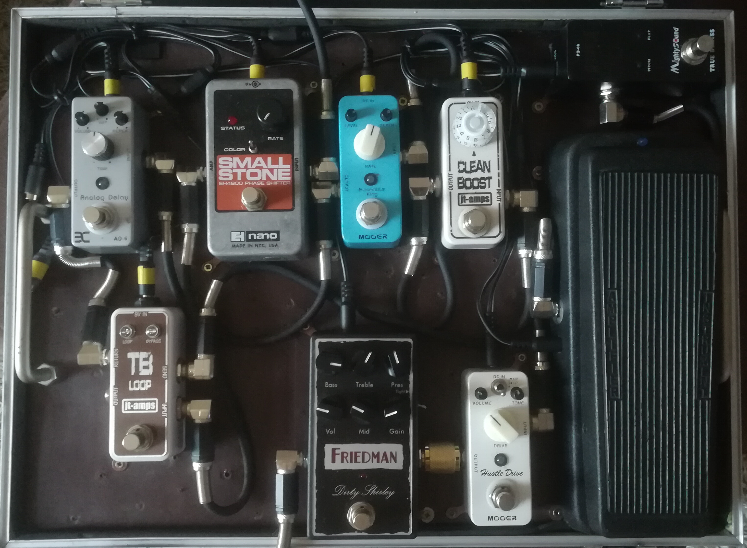 FENDER AM Perf Strat HSS RW 3STB, CORT M520 tab, CORT X11 blb, Oscar Schmidt OG8ceB, MARRIS LesPaul, Marshall VM 2266C, Tuner, Dunlop CryBaby Original, Mooer Hustle Drive, FRIEDMAN Dirty Shirley, FX~EHX-SmallStone, JT-AMPS Clean/Boost, MOOER Ensemble King, TCE AnalogDelay, JT-AMPS TBloop, Digitech RP-350